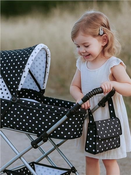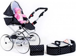 Elegant retro dukkevogn NEW BABY Natálka i hvid-sort prikket design vil glæde alle små omsorgspersoner. En stabil metalkonstruktion med affjedring og lette gummihjul sikrer en jævn og behagelig kørsel både inde og ude. Det justerbare håndtag i 5 positioner vokser med barnet, og den sammenklappelige kaleche beskytter dukken mod solen.