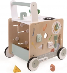 Takket være den robuste træramme er gangvognen stabil og holdbar, og de gummibelagte hjul sikrer stille og sikker kørsel på gulvet. På alle fire sider venter masser af aktiviteter: formsortering (fødevarer), roterende tandhjul, grøntsagslabyrint, vask med armatur, kogeplade og gennemsigtig ovn. Gangvognen er en ideel gave til tumlinge fra 12 måneder.