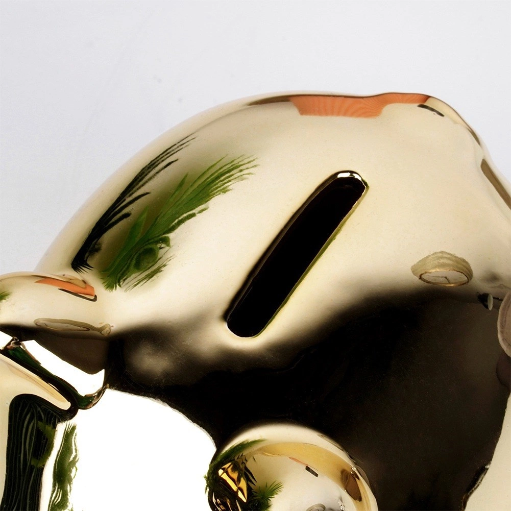 Den refleksive, glansfulde overflade i guld giver sparegrisen et luksuriøst udtryk og gør den til et markant dekorativt element.