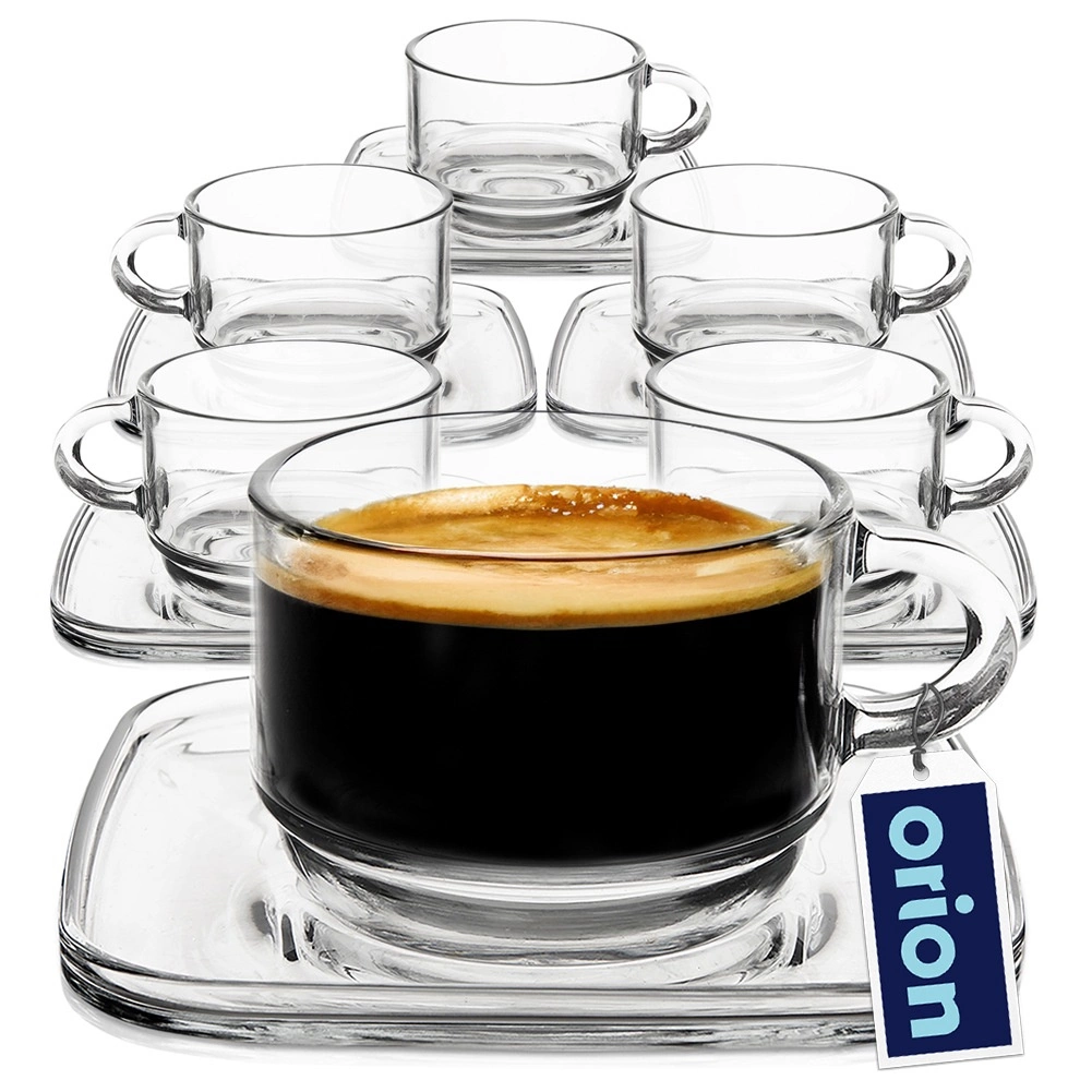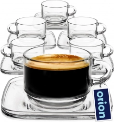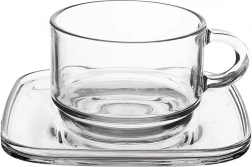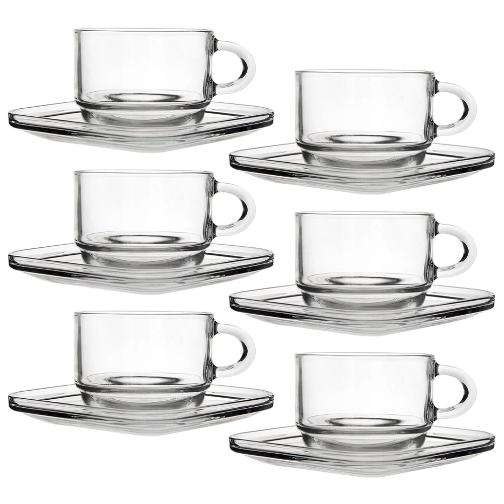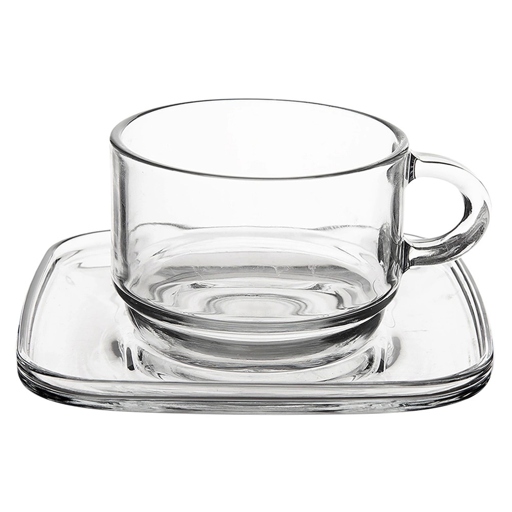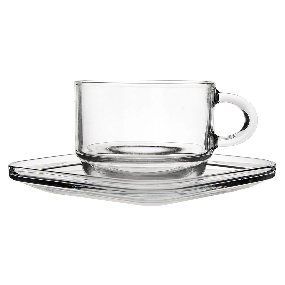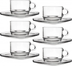 Elegant sæt med seks glaskopper med kvadratiske underkopper, volumen 250 ml, til daglig servering af kaffe, te og urteinfusioner. Fremstillet af kvalitetsklart glas, som smukt fremhæver drikkens farve. Kopperne har et ergonomisk håndtag for behageligt greb, moderne kvadratiske underkopper for stabilitet og stil og er egnede til opvaskemaskine for nem vedligeholdelse.