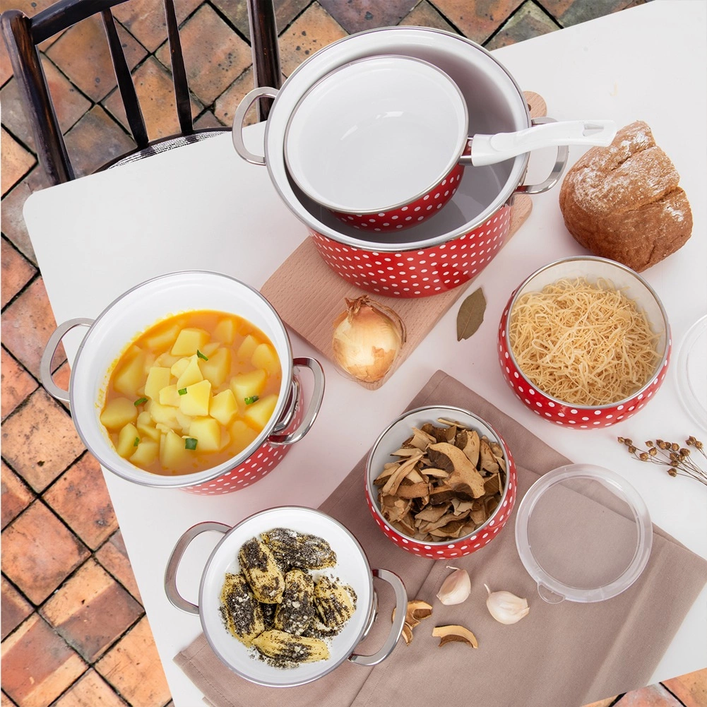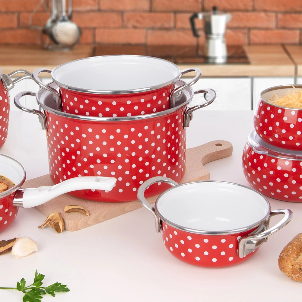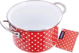 Den populære emaljerede gryde i rød med hvide prikker bringer et strejf af retrostil til køkkenet og byder samtidig på praktiske egenskaber til daglig madlavning. Den solide krop af emaljeret stål sikrer jævn varmefordeling og lang levetid, den rustfri kant og de robuste sidehåndtag sørger for sikker håndtering.