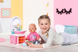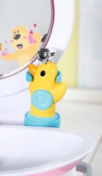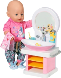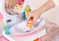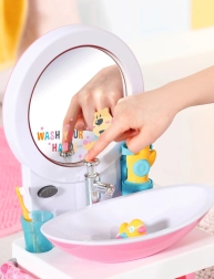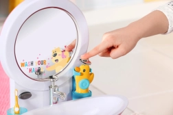 Det sjove dukkeservante til BABY born gør daglig hygiejne til leg. Når du trykker på knappen, lyser spejlet op, og en melodi fungerer som timer for håndvask. Sæbedispenser, rindende vand ved tryk på hanen og en andefrommet prop giver en realistisk legeoplevelse. Inkluderer tandbørste, kop med tandbørstelyde og håndklæde.