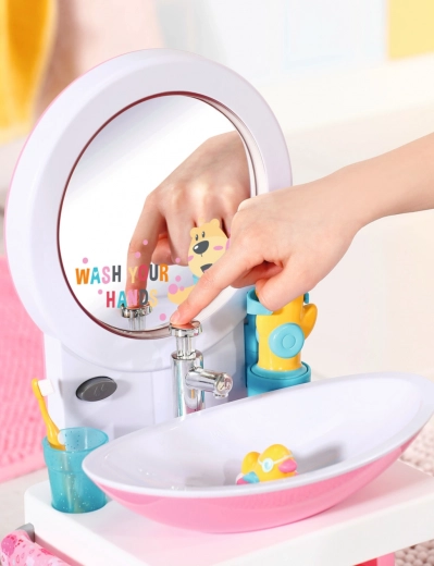 Lær børn gode hygiejnevaner gennem leg. Det hvid-rosa dukkeservante til BABY born byder på lys- og lydeffekter, en rigtig vandstråle ved tryk på hanen og søde tilbehør til komplet pleje. Når spejlet lyser, afspilles en melodi, der fungerer som en legende timer til håndvask.