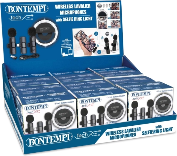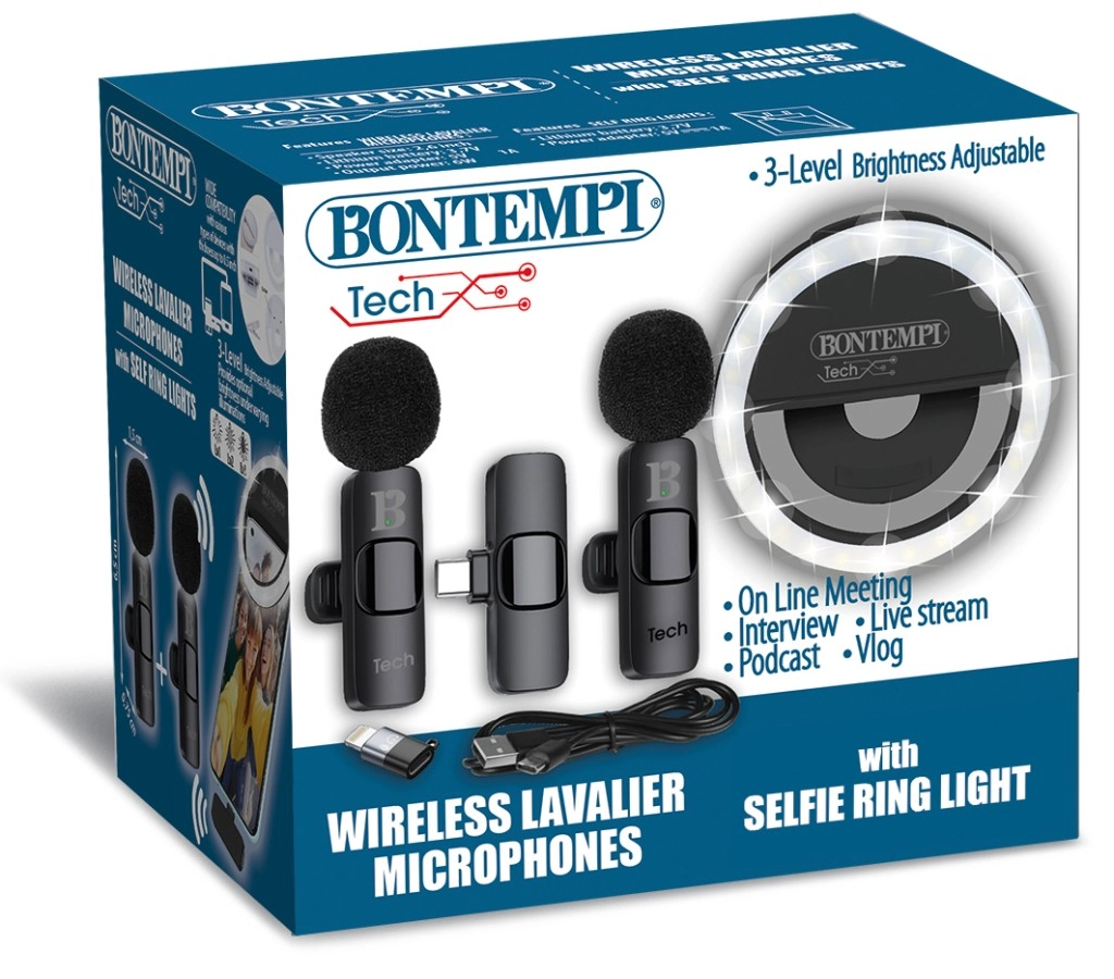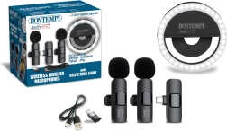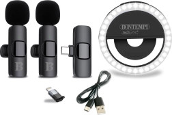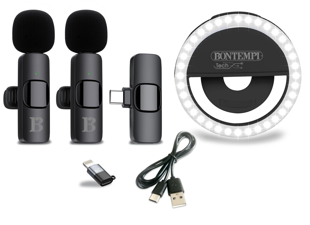 Dette praktiske sæt forener kvalitetsbelysning og trådløs lydoptagelse i ét. Mini ring LED-lyset fastgøres nemt og sikrer med 3 lysstyrkeniveauer en naturlig belysning ved optagelse med frontkamera. De to clip-on mikrofoner sættes på tøjet og gengiver stemmen pålideligt uden omgivel sesstøj — værdsat af vloggere, skabere af Reels/Shorts og podcastere.