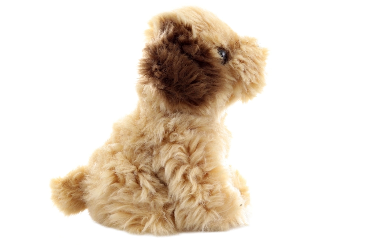 Mørkere ører, sort snude og siddende positur giver legetøjet et troværdigt udseende som en rigtig hvalp.
