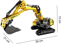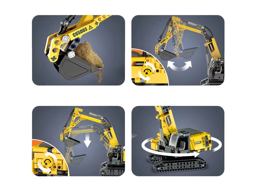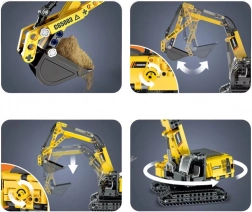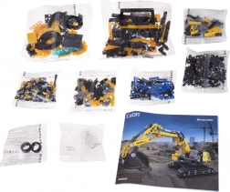 Bygningen er glidende takket være præcist tilpassede dele, og den færdige konstruktion er solid og stabil. Den gul‑grå farve og klistermærker understreger det realistiske udseende. Gravemaskinen har en funktionel arm med løft, en bevægelig skovl, en 360° roterende kabine og bælter for jævn bevægelse.