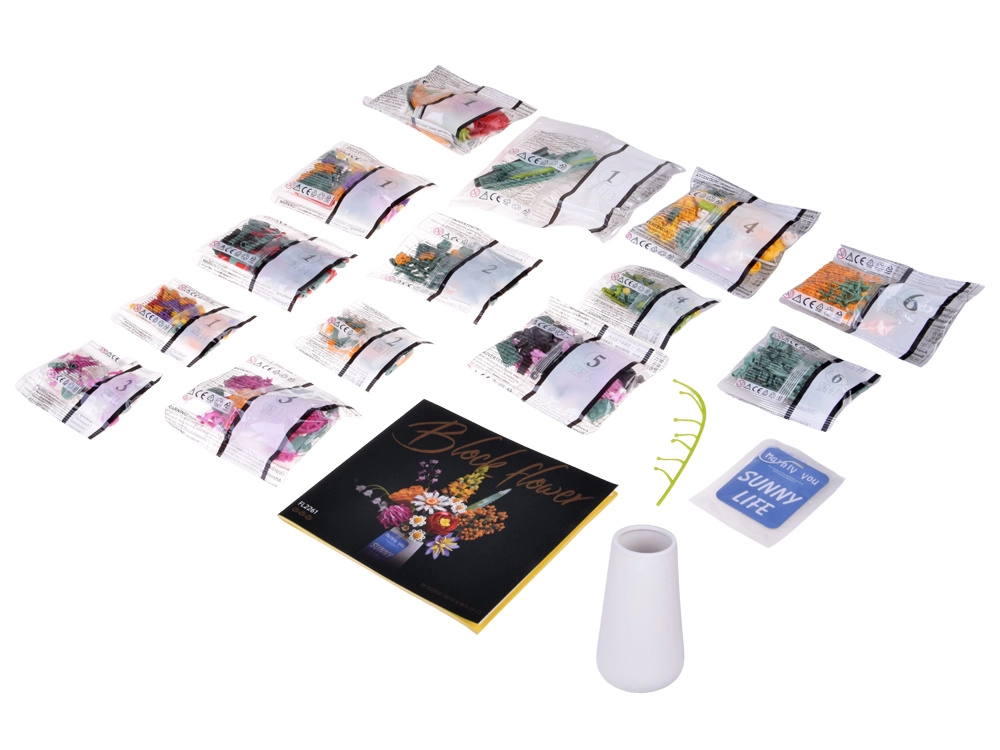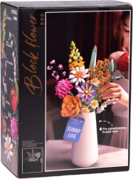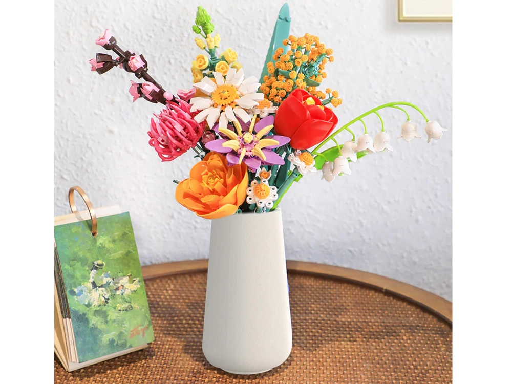 Dette design-sæt kombinerer kreativ bygning med moderne boligdekoration. I pakken finder du alt til at samle en farverig blomsterbuket – fra små tusindfryd til markante krysantemum, alt sammen suppleret af en mat keramisk vase, som giver arrangementet stabilitet og et rent udtryk.
