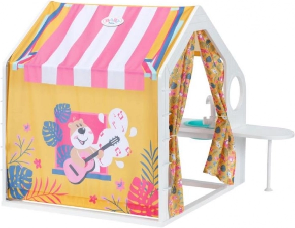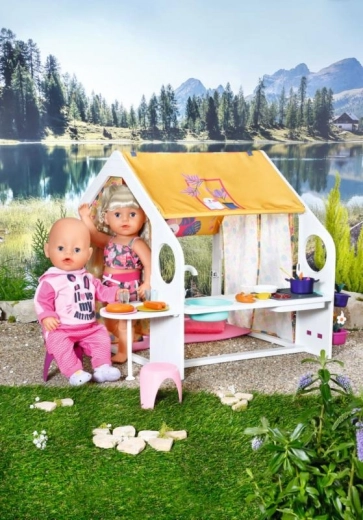BABY born dukkeweekendhus er ideelt til glamping-leg. Med de gule sidevægge, der kan åbnes, får du rigelig plads til alle legeaktiviteter.