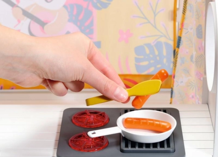 Ud over sjov madservering kan børn bruge huset til at nyde solnedgangen og putte dukkerne i sovehjørnet med lyserøde accessories.