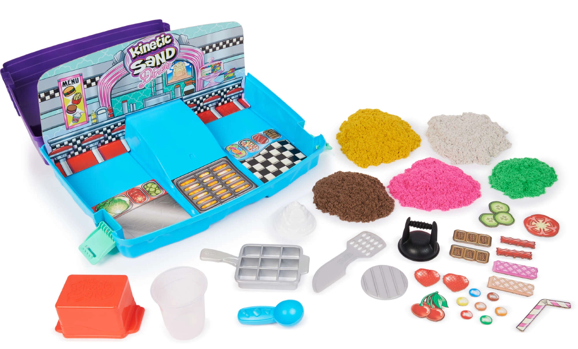 Sættet Kinetic Sand Grill N’ Scoop Diner glæder små kokke og kreative sjæle. Åbn den turkise kuffert, og den forvandles til en diner-scene med grill, forme og værktøjer. Det farvede kinetiske sand kan nemt øses, presses og formes til burgere, pomfritter, vafler eller isdesserter – kun fantasien sætter grænser.