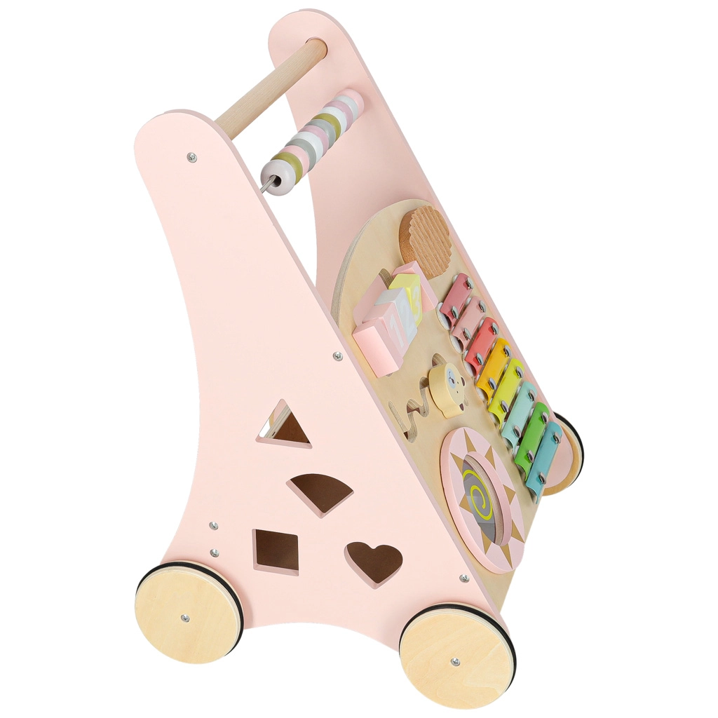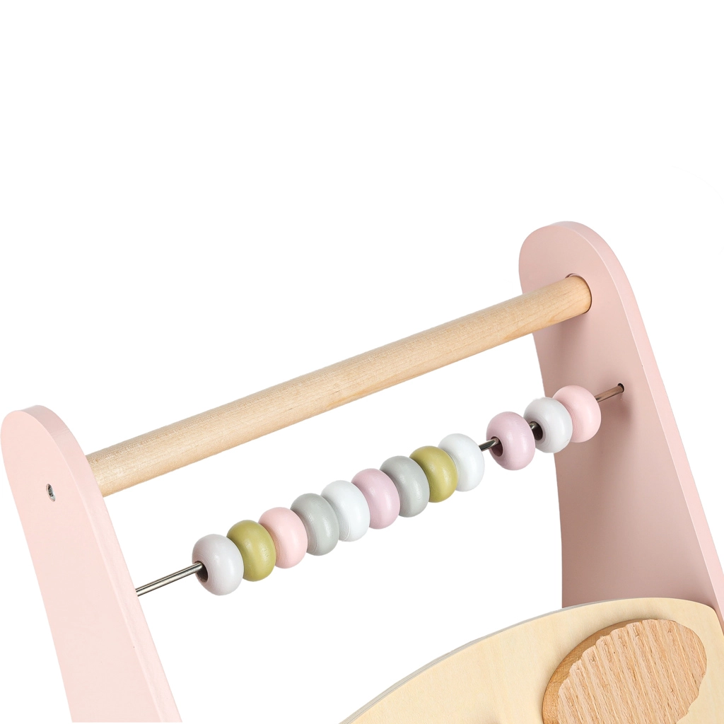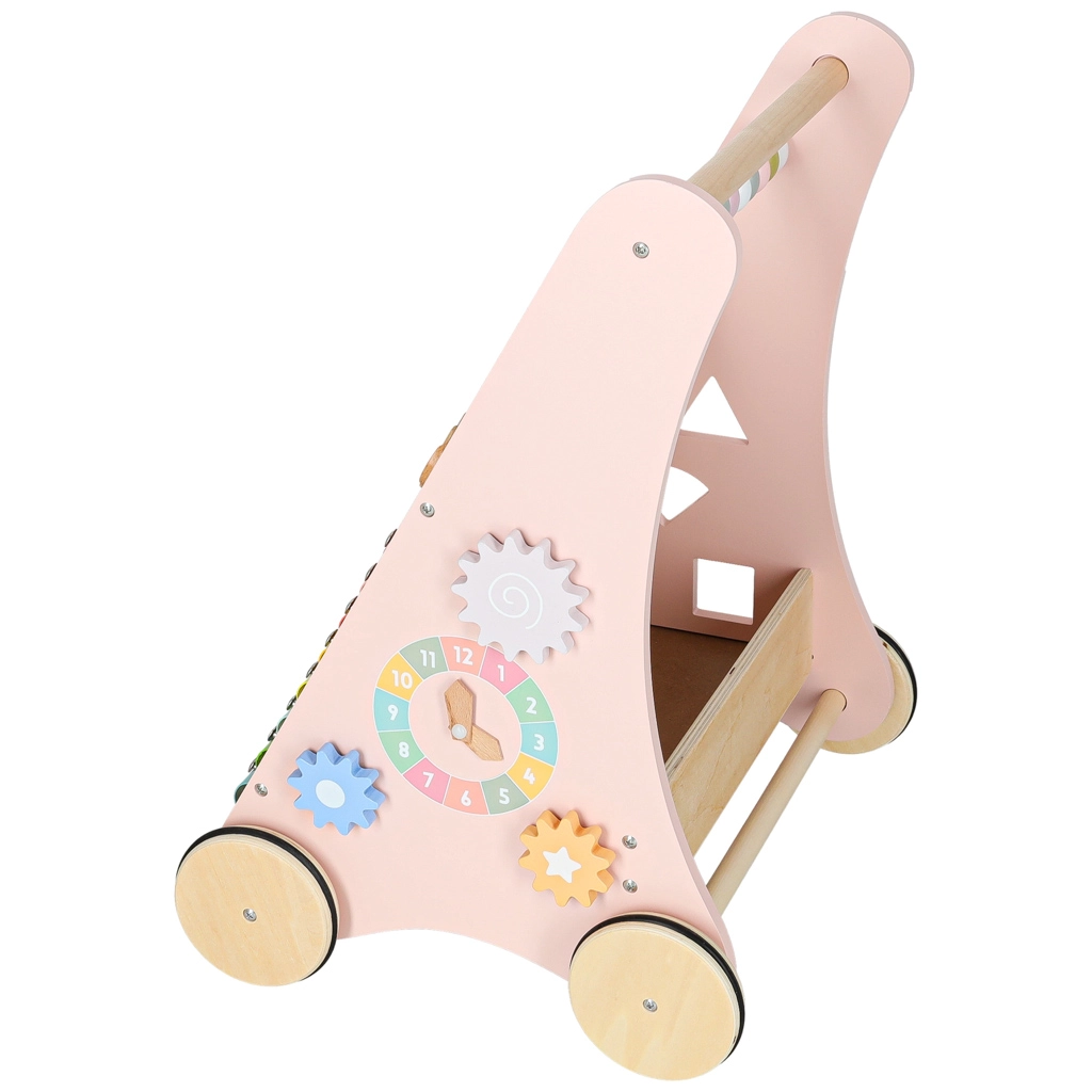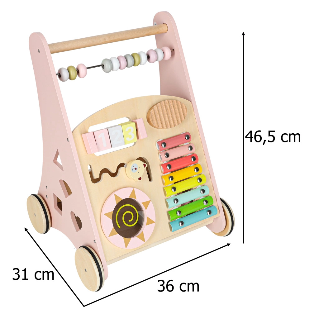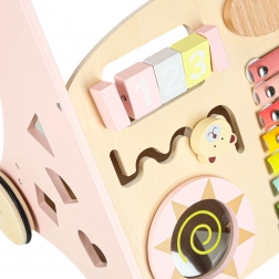 Denne stilfulde træ-gåvogn i pastel-lyserød støtter balance, koordination og selvtillid ved gang. Frontpanelet har mange aktiviteter: tæller til de første regnestykker, xylofon til at udforske lyde, tandhjul, drejeskive, formsortering og skydbare elementer, som udvikler finmotorik og koncentration.