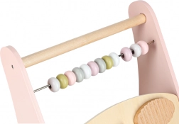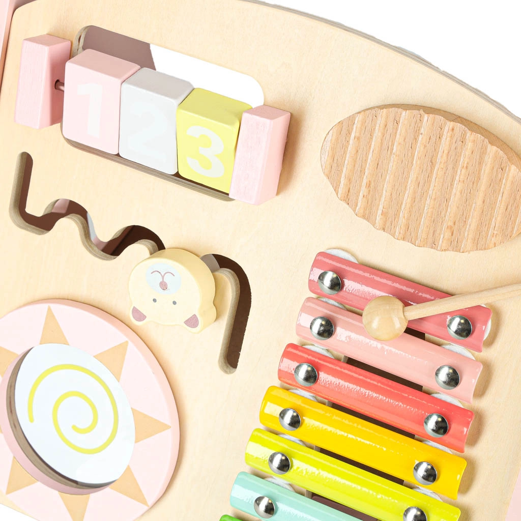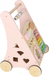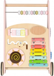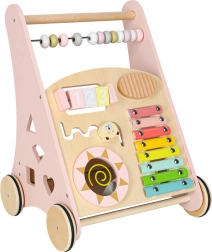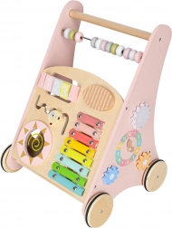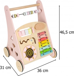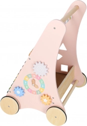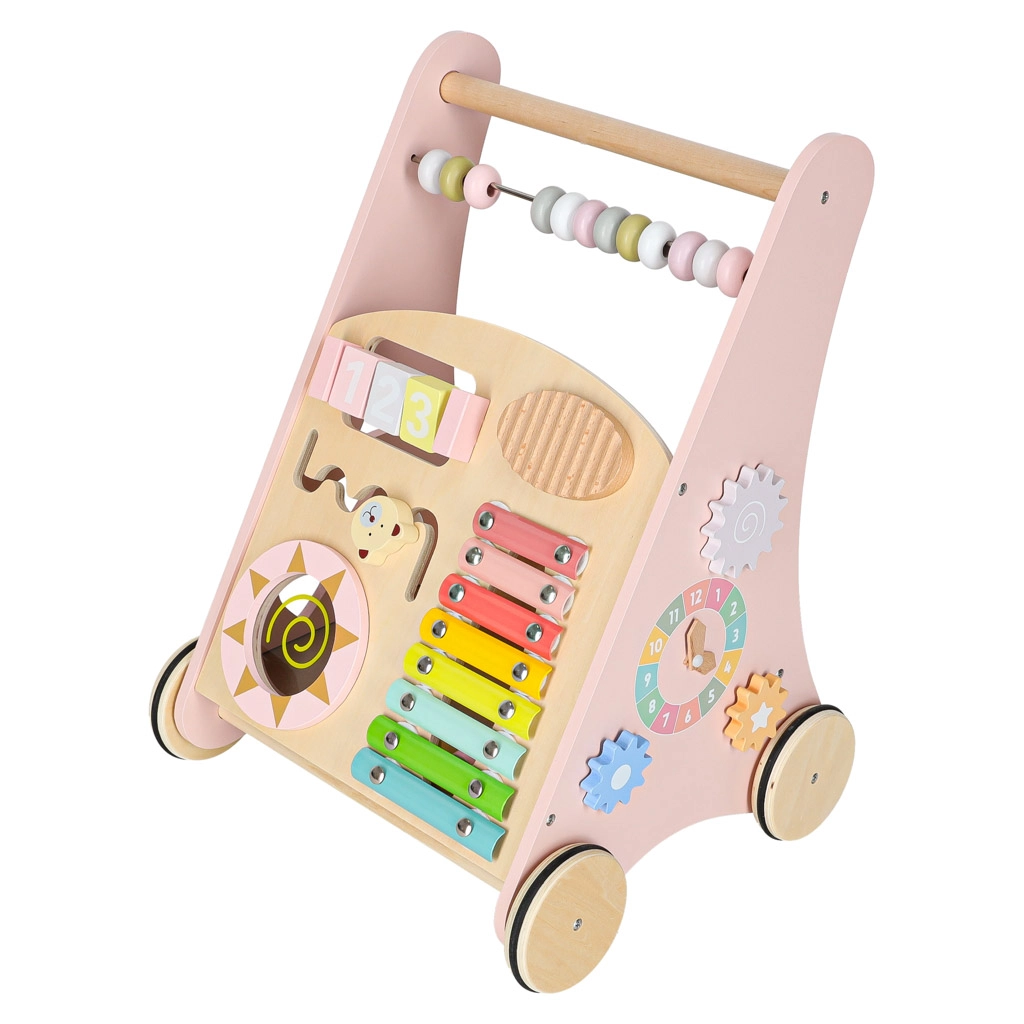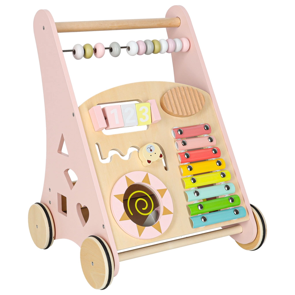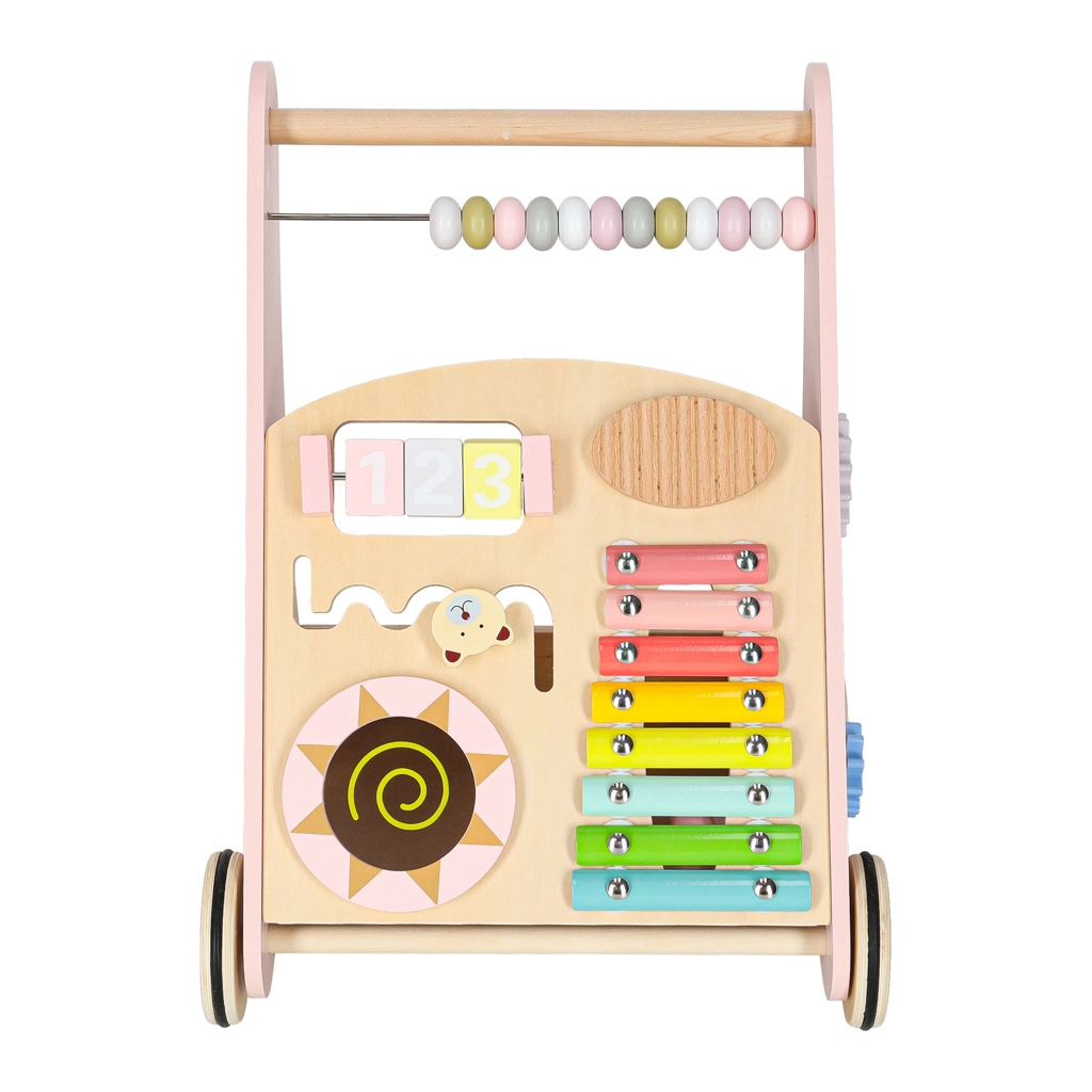 Denne stilfulde træ-gåvogn i pastel-lyserød støtter balance, koordination og selvtillid ved gang. Frontpanelet har mange aktiviteter: tæller til de første regnestykker, xylofon til at udforske lyde, tandhjul, drejeskive, formsortering og skydbare elementer, som udvikler finmotorik og koncentration.