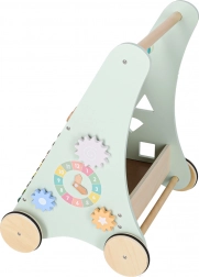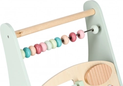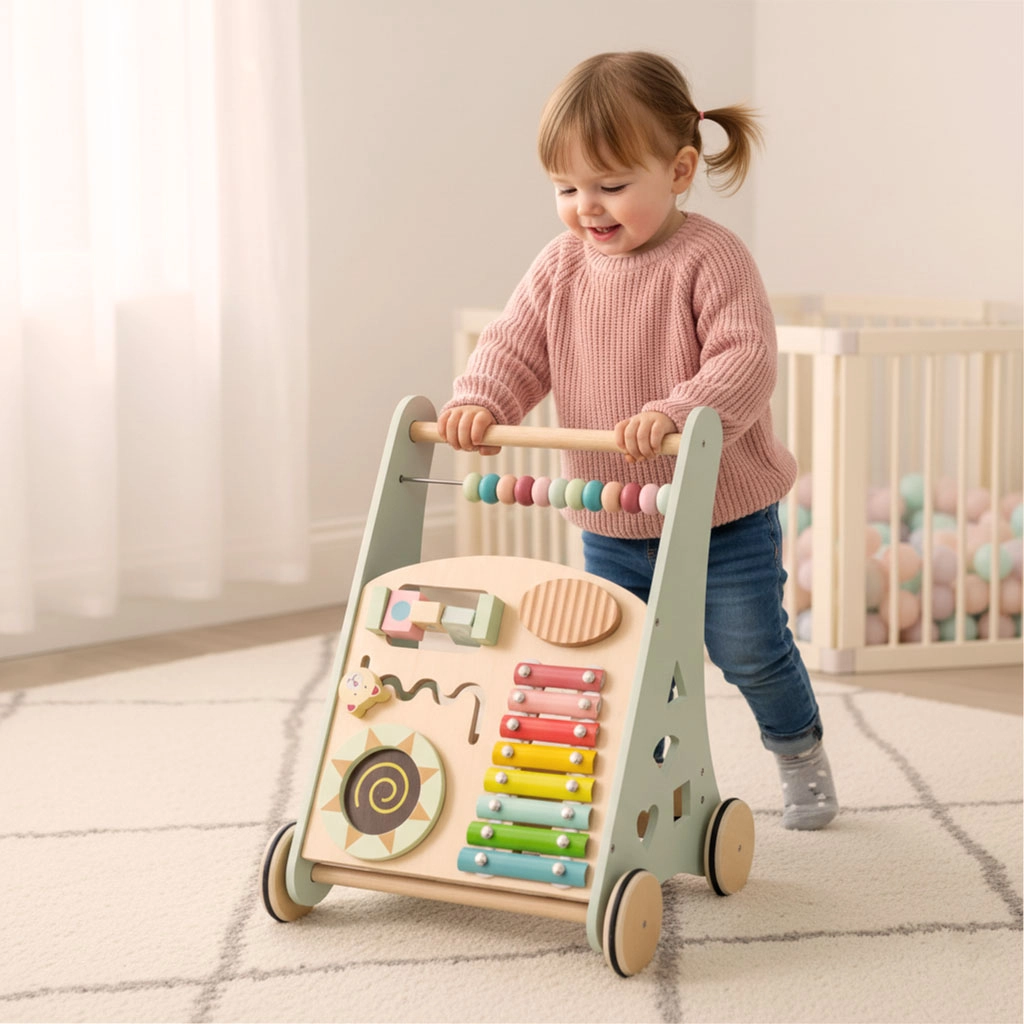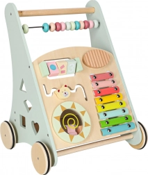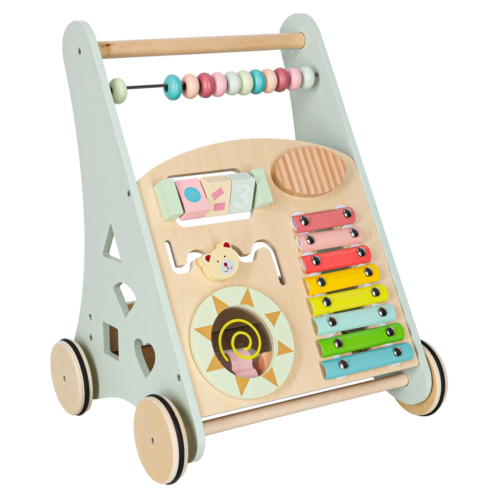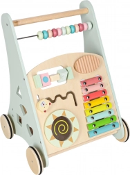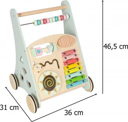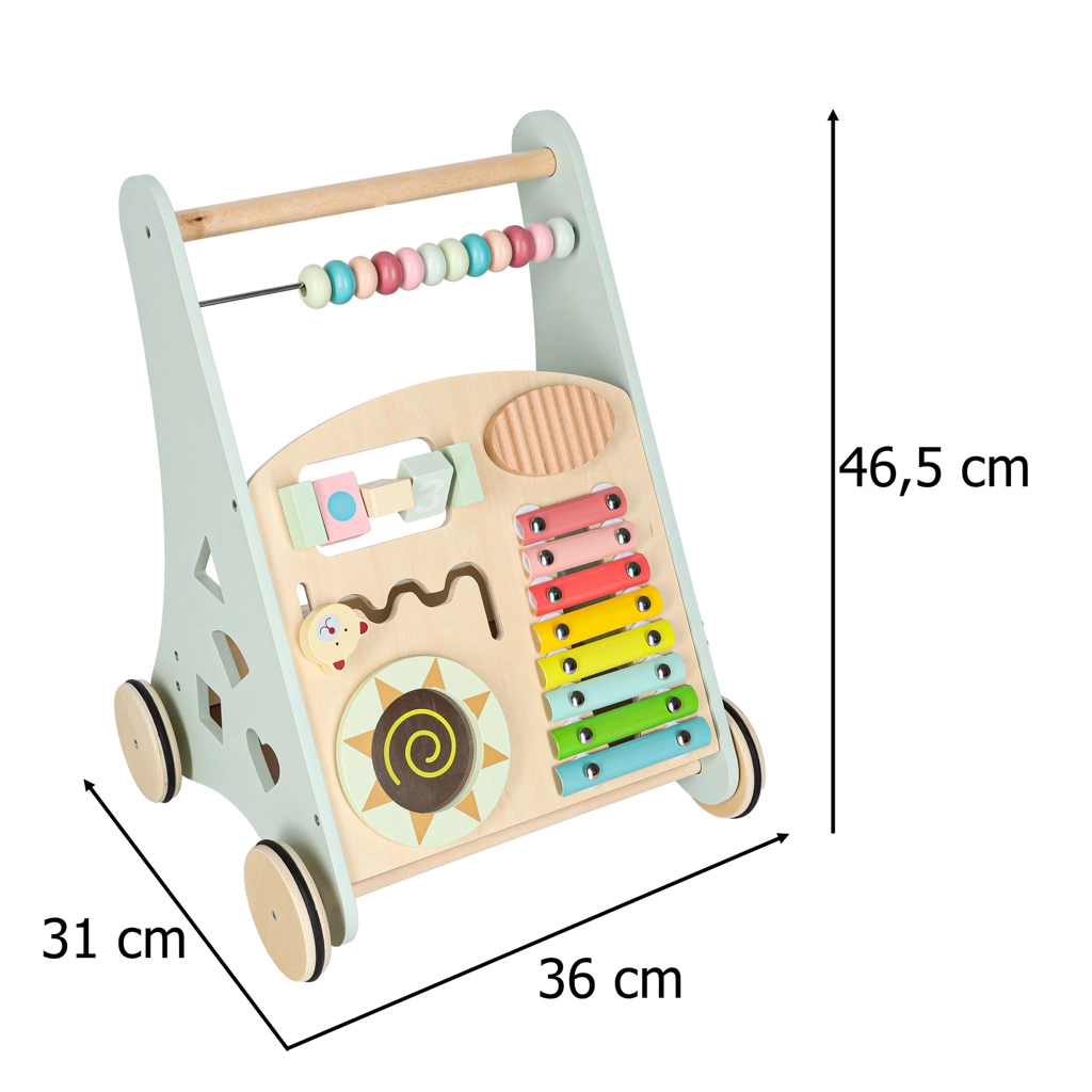 Det multifunktionelle trægangstativ kombinerer støtte ved de første skridt med et legende aktivitetscenter. Barnet træner balance, hånd-øje-koordination og finmotorik ved at skubbe, dreje eller lægge former i. De pastelagtige farver og det glat forarbejdede træ indbyder til nysgerrighed, mens xylofonen fremmer rytme og musikalsk sans.