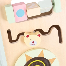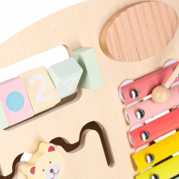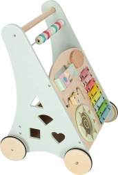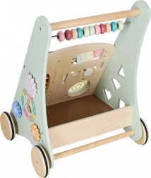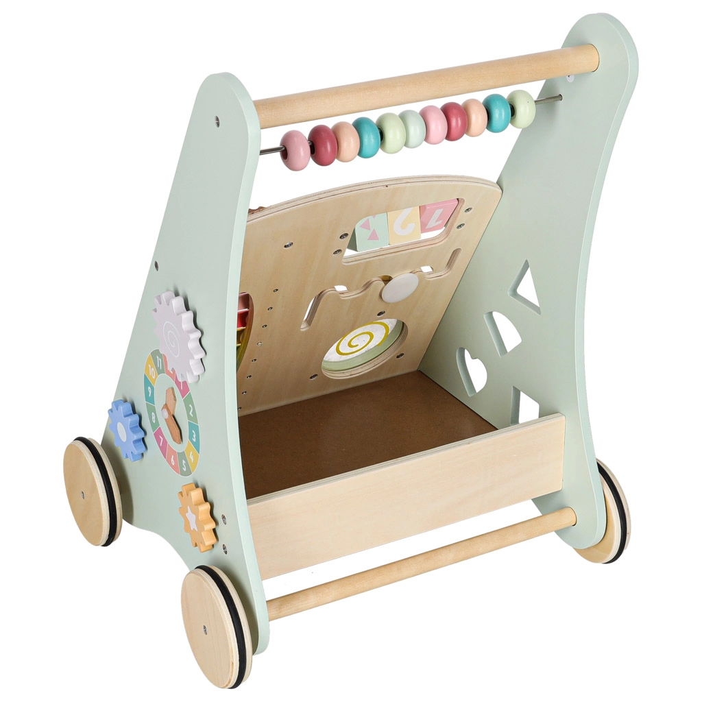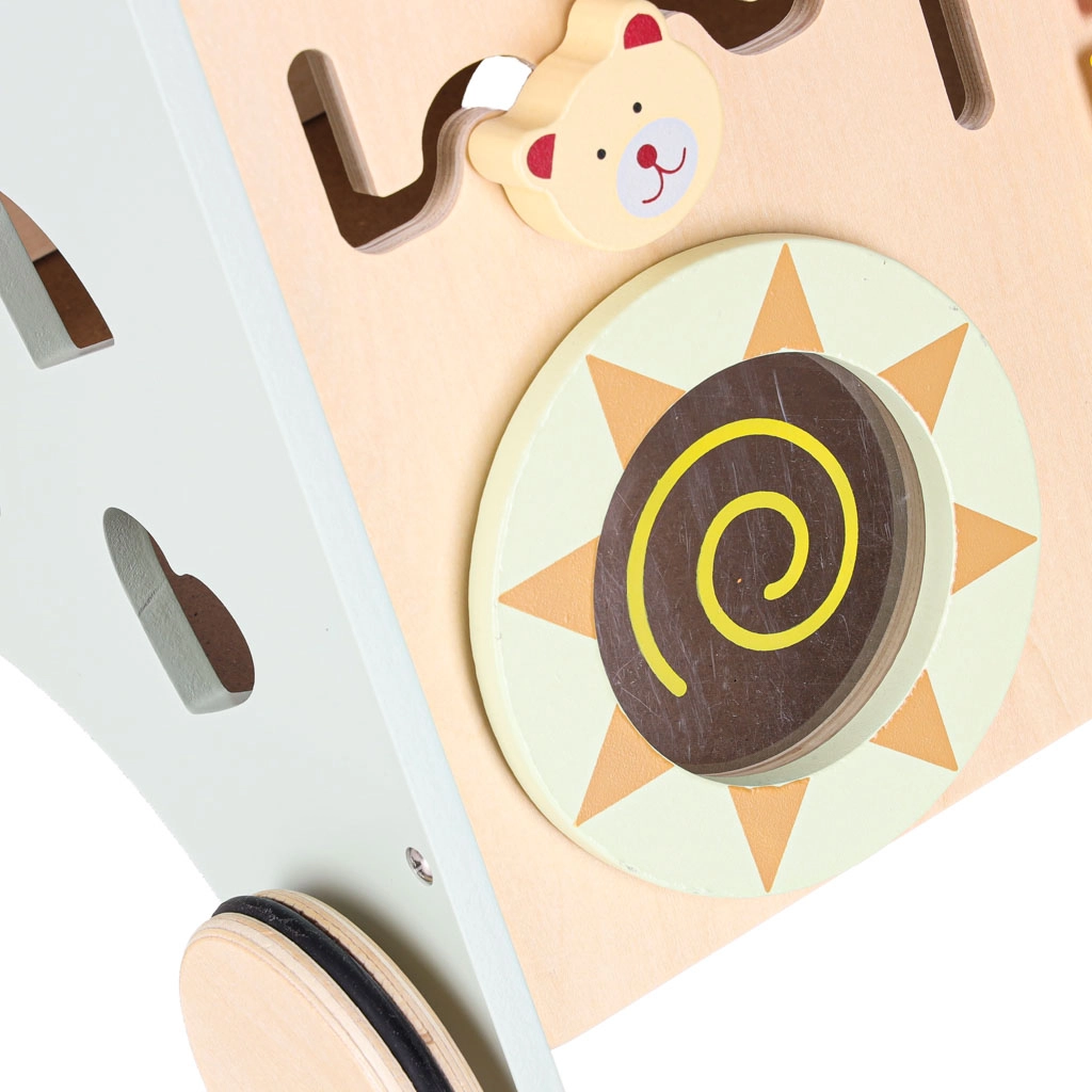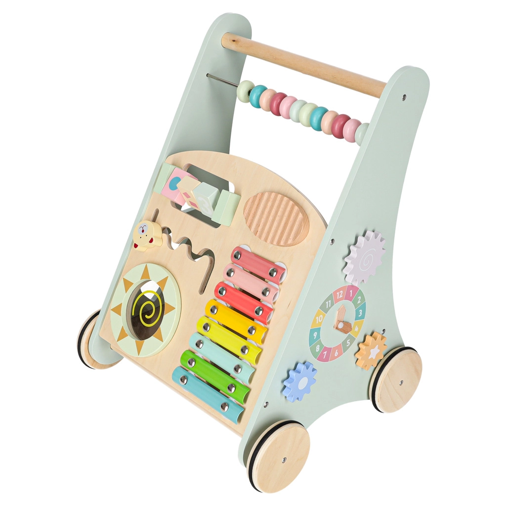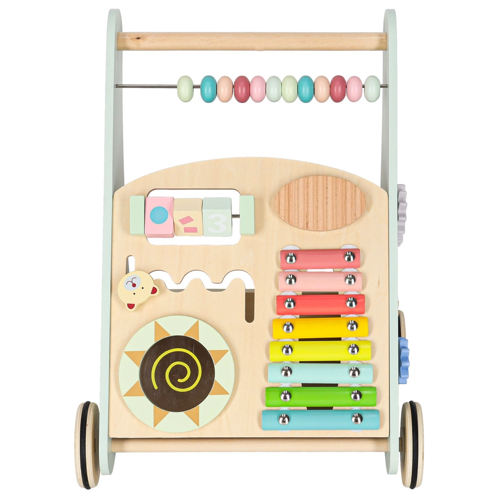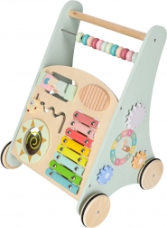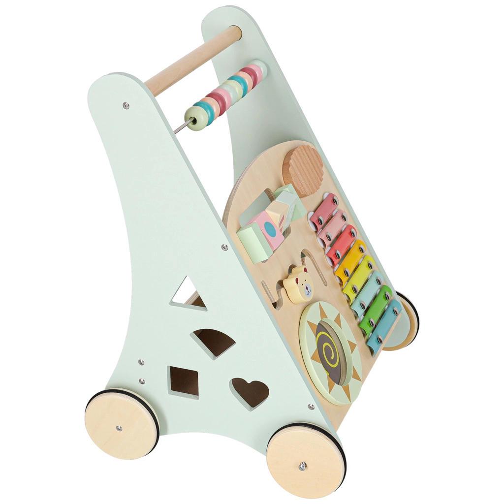 På frontpanelet venter en xylofon med køller, en kugleramme til de første skridt i at tælle og en formsorteringsboks til at lære farver og former. Tandhjul, perlelabrint og ur udvikler logisk tænkning og forståelse af årsag og virkning. Gummiringene på hjulene giver bedre greb og en stille kørsel.