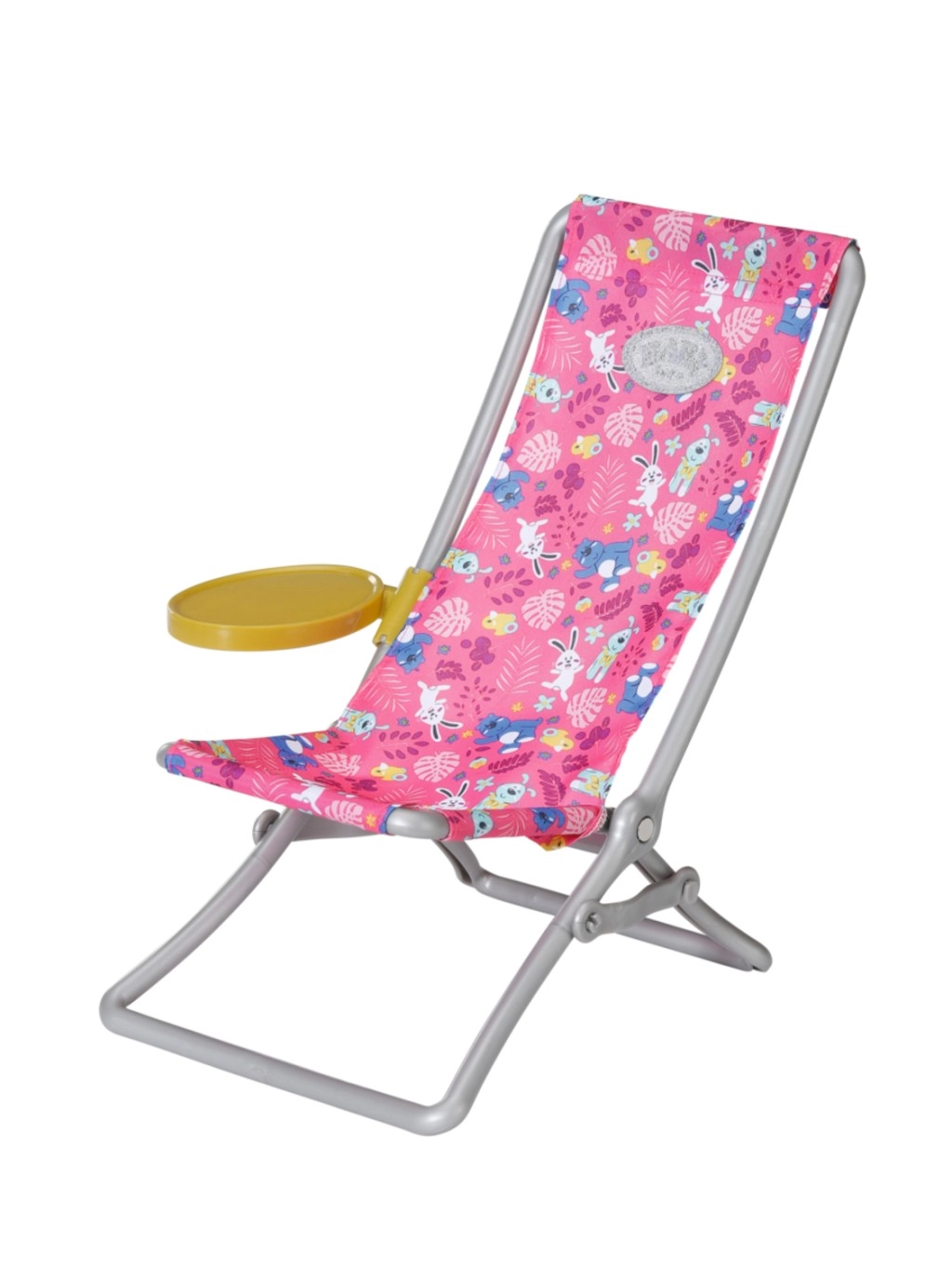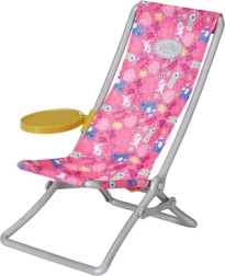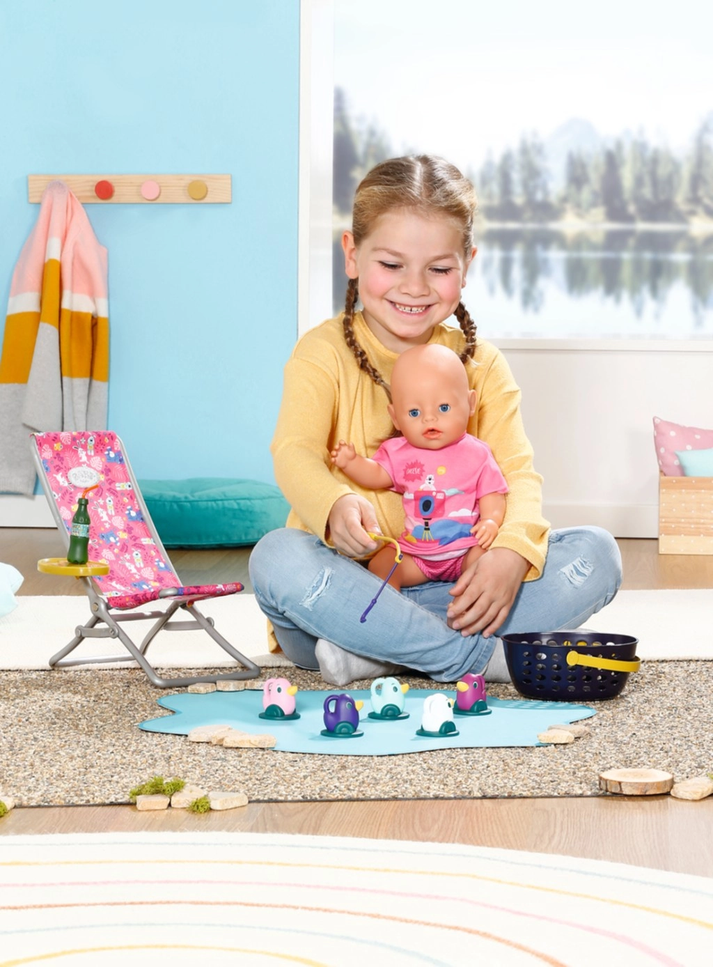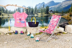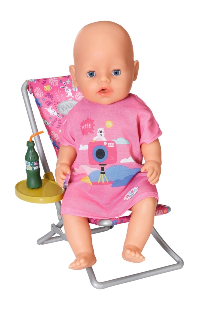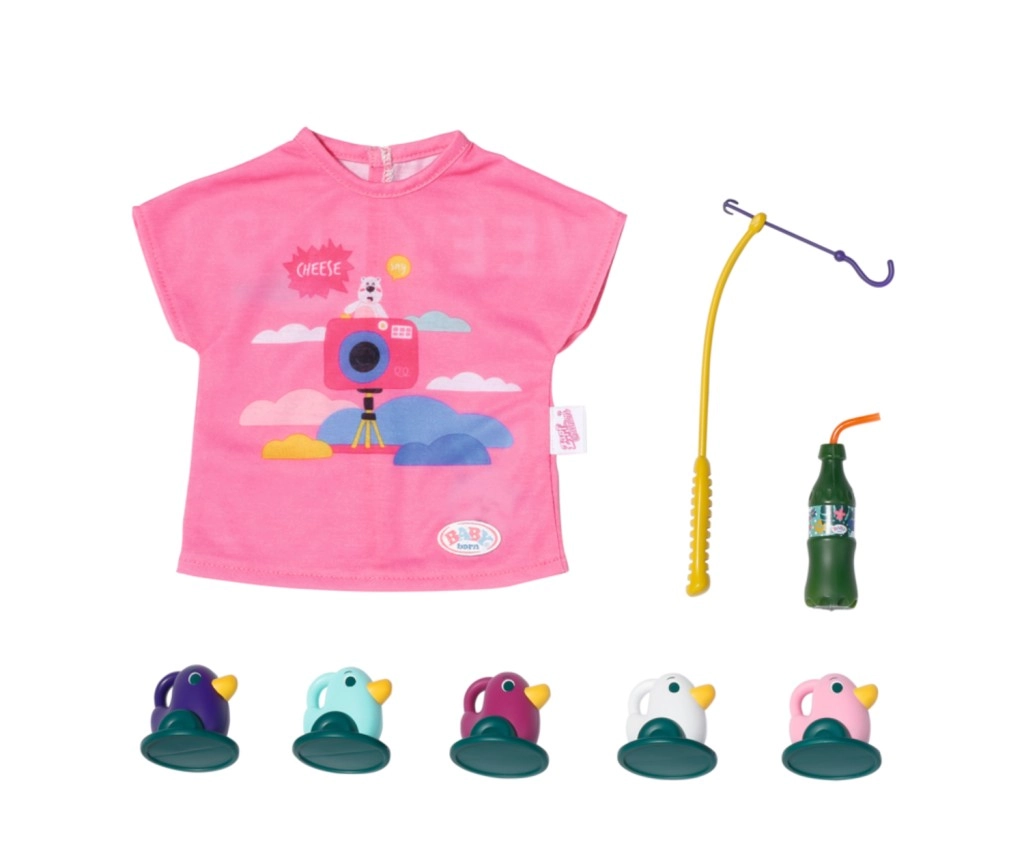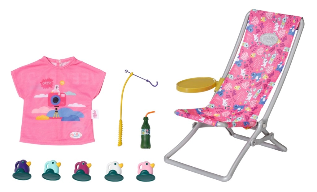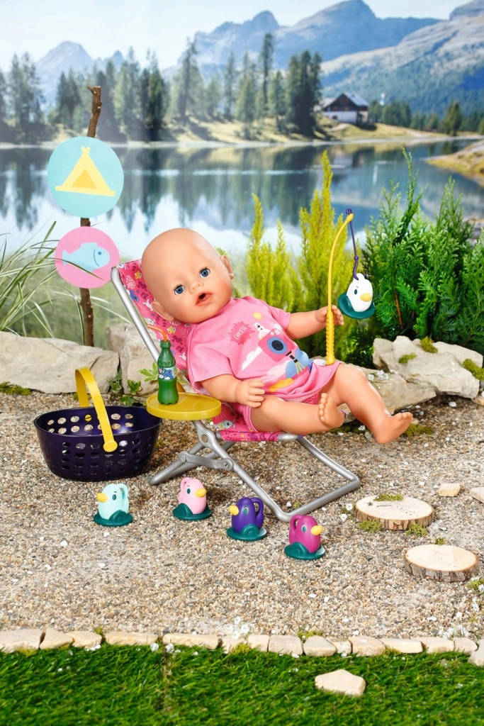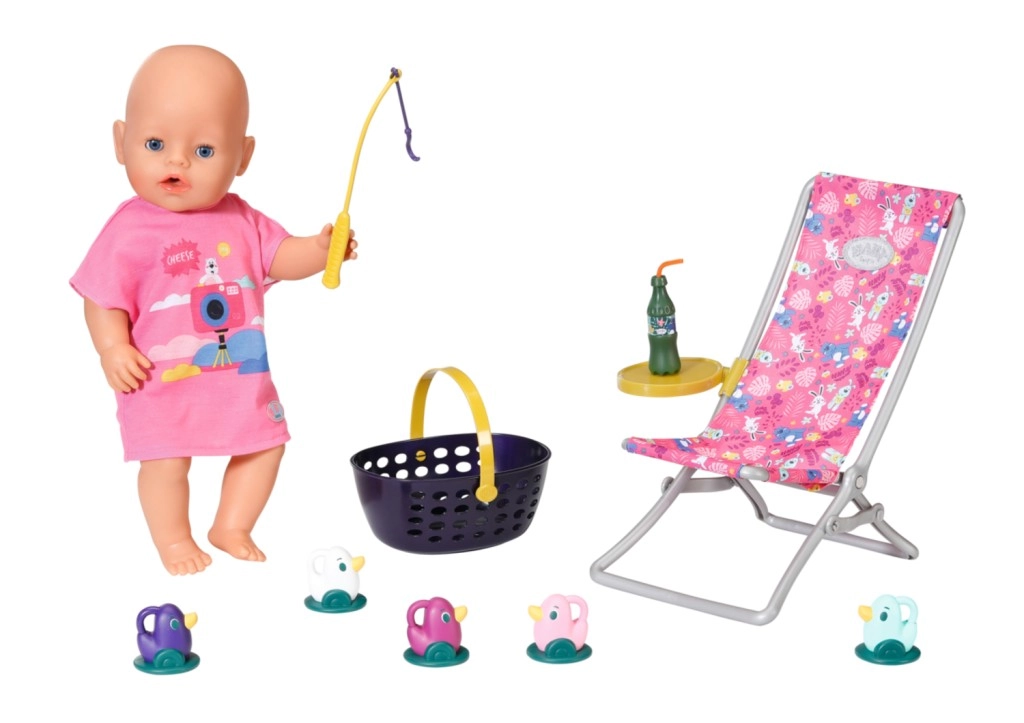 "Der er mange flere fisk i havet…" Men BABY born fanger hellere søde små ællinger. Mens hun sidder behageligt i en lyserød liggestol med farverigt mønster, prøver hun at fange en af de fem ællinger på fiskestangens krog. Indimellem tager hun en slurk limonade, som står på det gule bord ved liggestolen. Når hun har fisket alle ællingerne op og lagt dem i den blå kurv, sætter hun dem tilbage i dammen, og den sjove leg kan begynde forfra. Til denne fiskeleg har BABY born taget en afslappet, lang, lyserød T-shirt med sødt print på. • Kvalitetstilbehør til den originale BABY born-dukke. • Til glæde for fantasifuld, varieret og langvarig leg. • Velegnet til dukker i størrelserne 36 cm og 43 cm. BABY born Weekend-fiskesæt indeholder outfit, liggestol med bord, flaske med limonade, kurv, 5 ællinger og fiskestang.