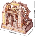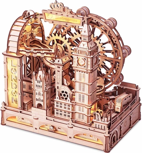 Oplev Londons ikoniske vartegn i form af et elegant 3D træpuslespil. Modellen kombinerer Big Ben, Tower Bridge og London Eye med en dynamisk kuglebane, hvor metal-kugler suser gennem ramper og tunneler ved hjælp af tyngdekraften og en kraftig motor. De symbolske Kronjuveler er heller ikke glemt – alt udført med fokus på præcision.