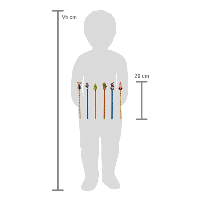 Hver blyant har på toppen en dekorativ 3D-træfigur (rensdyr, snemand, juletræ, honningkagefigur, pingvin eller julemand), som forvandler almindelig skrivning til en sjov, festlig aktivitet. Takket være det solide træskaft er blyanten behagelig at skrive og tegne med derhjemme, i skole og i børnehave.