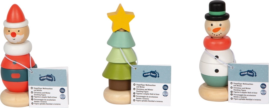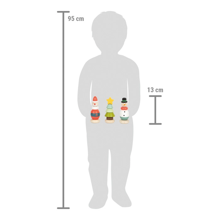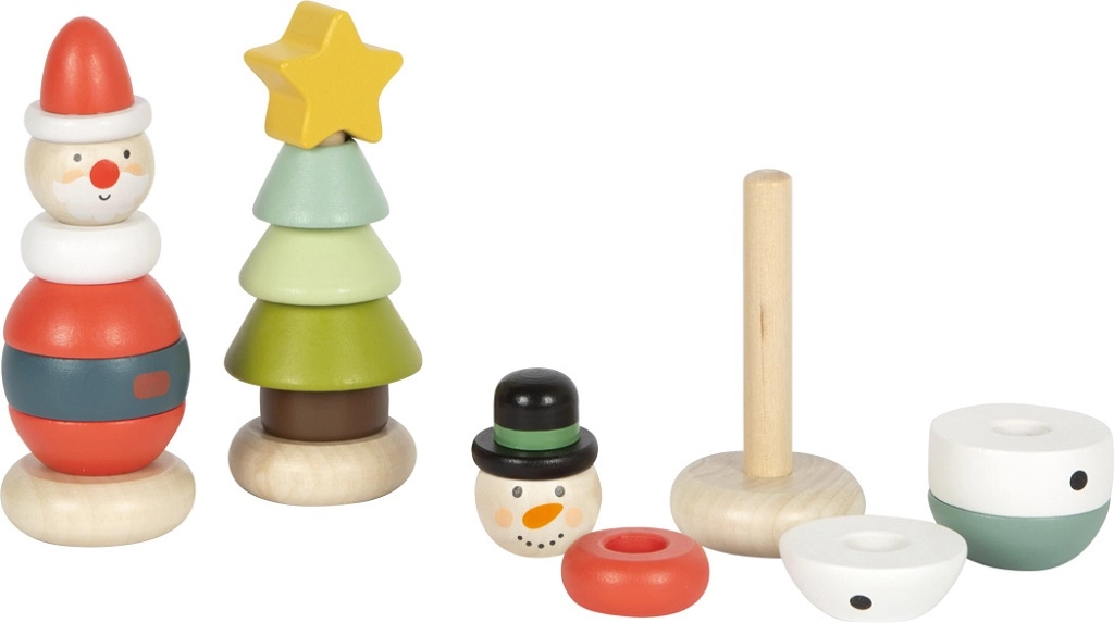 Oplev glæden ved jule-stabling! Træfigurerne i form af JULEMANDEN, et juletræ med gylden stjerne og en smilende snemand består af flere farvede ringe og dele, som sættes på en solid pind. Legen motiverer intuitivt børn til at træne greb, præcision og koncentration – og skaber samtidig en skøn, festlig stemning på børneværelset og i stuen.