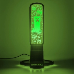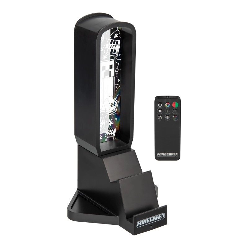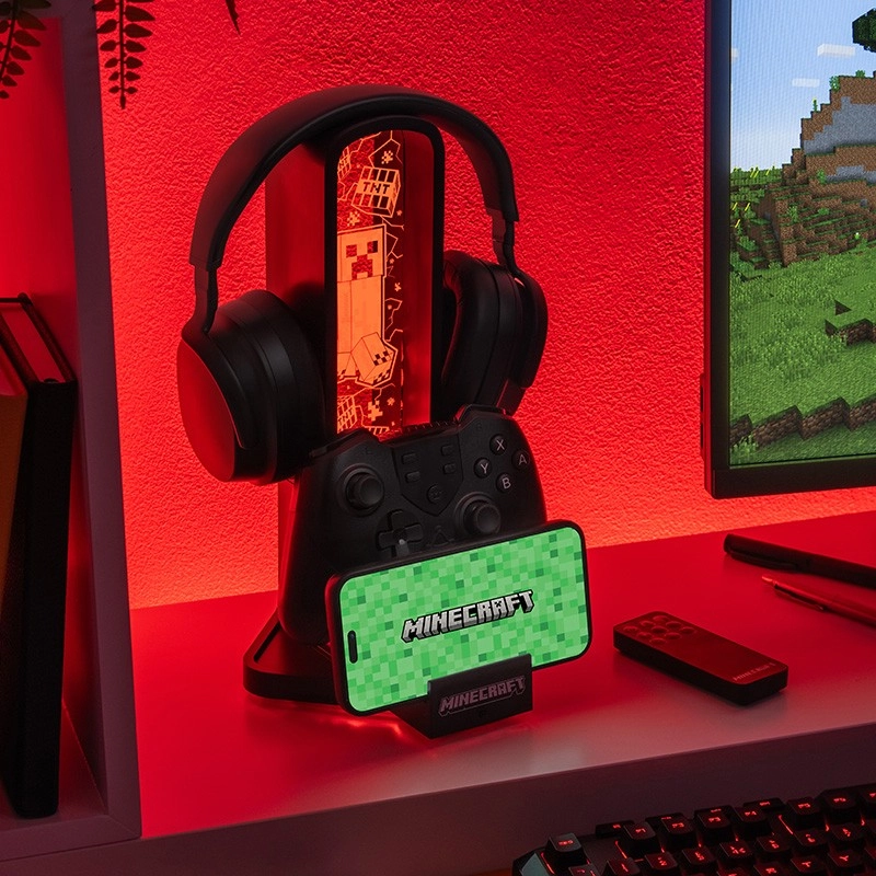 En stilfuld hovedtelefonholder inspireret af Minecraft-universet imponerer med en højde på 30 cm, flerfarvede lystilstande, en praktisk telefonholder og to USB‑C-porte til opladning af tilbehør. Betjeningen er nem takket være en fjernbetjening, og strømtilførsel sker via USB-kabel, som er inkluderet i pakken.