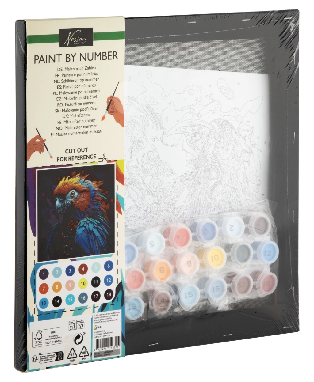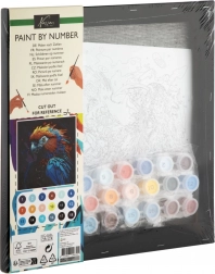 Opdag magien ved maleri efter tal, og forvandl det fortrykte papegøjemotiv på sort baggrund til et iøjnefaldende billede med strålende farver. De nummererede felter svarer til farverne i sættet, så maleriet er intuitivt selv for begyndere. Det sorte lærred giver motivet dybde og et moderne udtryk.