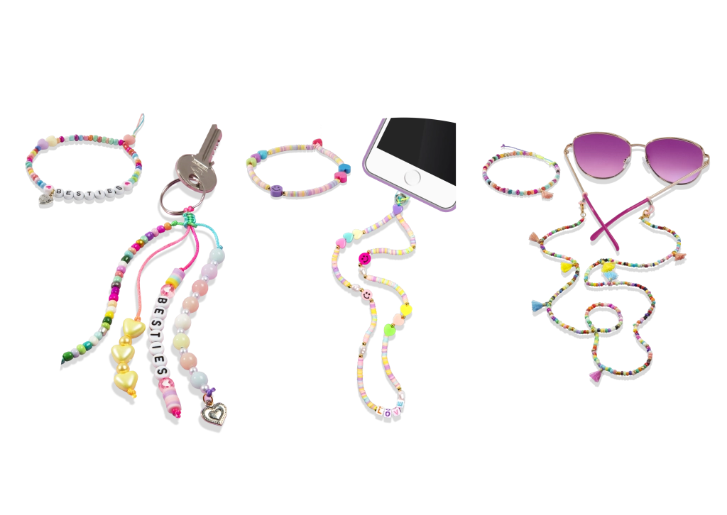 Takket være bogstavperler og dekorative vedhæng kan du lave accessories med navne, initialer eller beskeder – helt efter din smag.