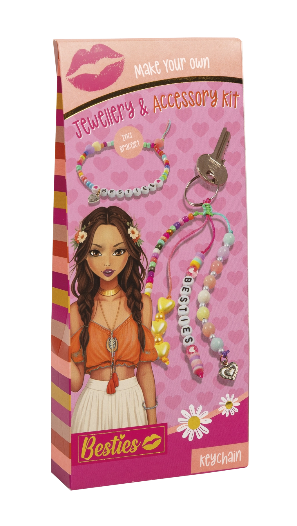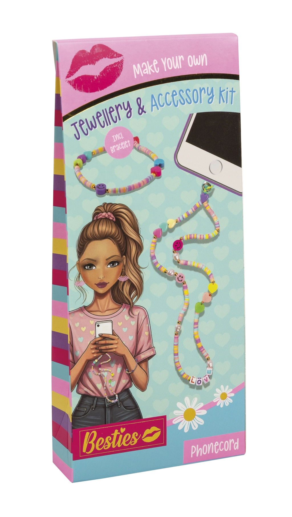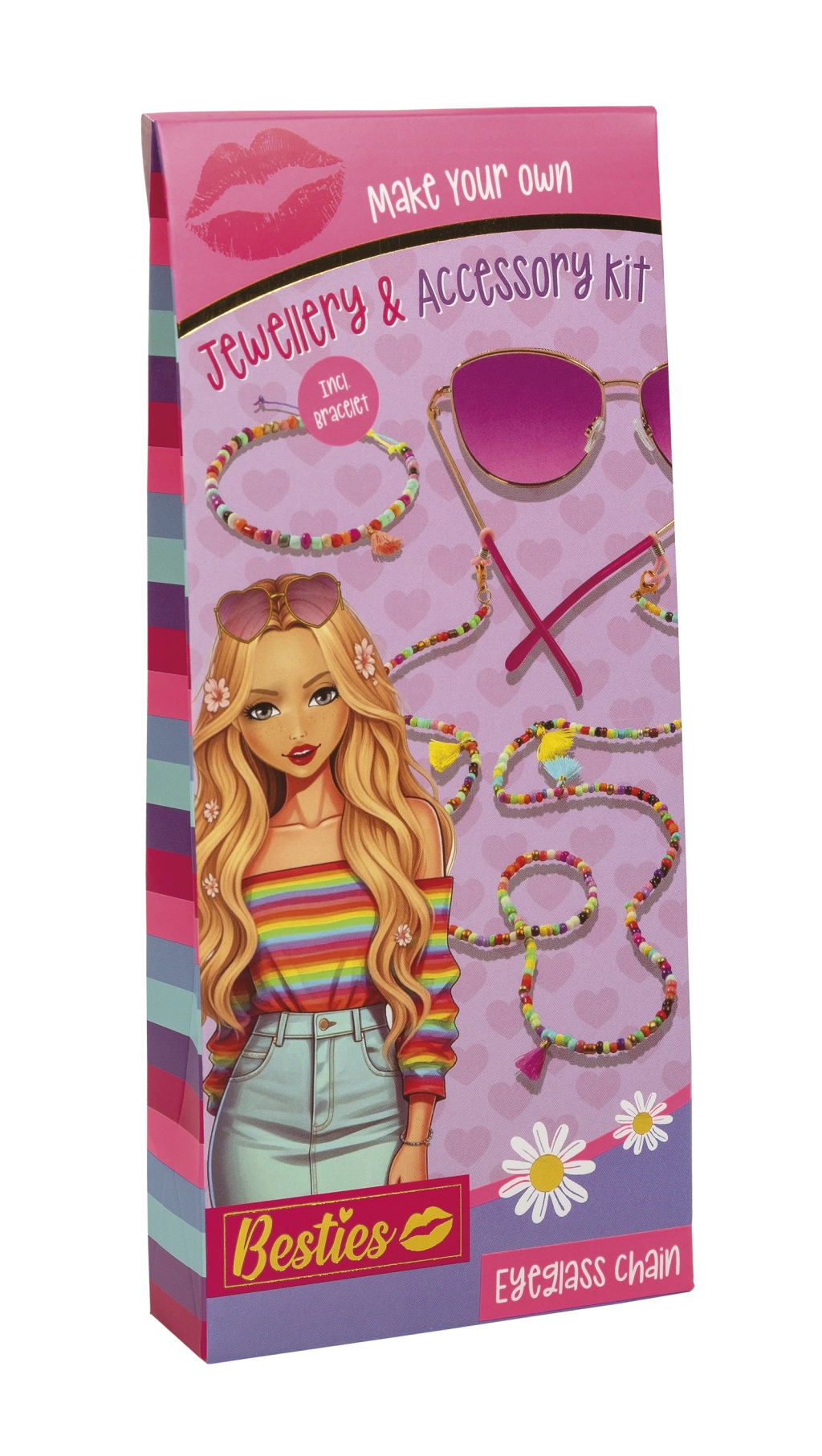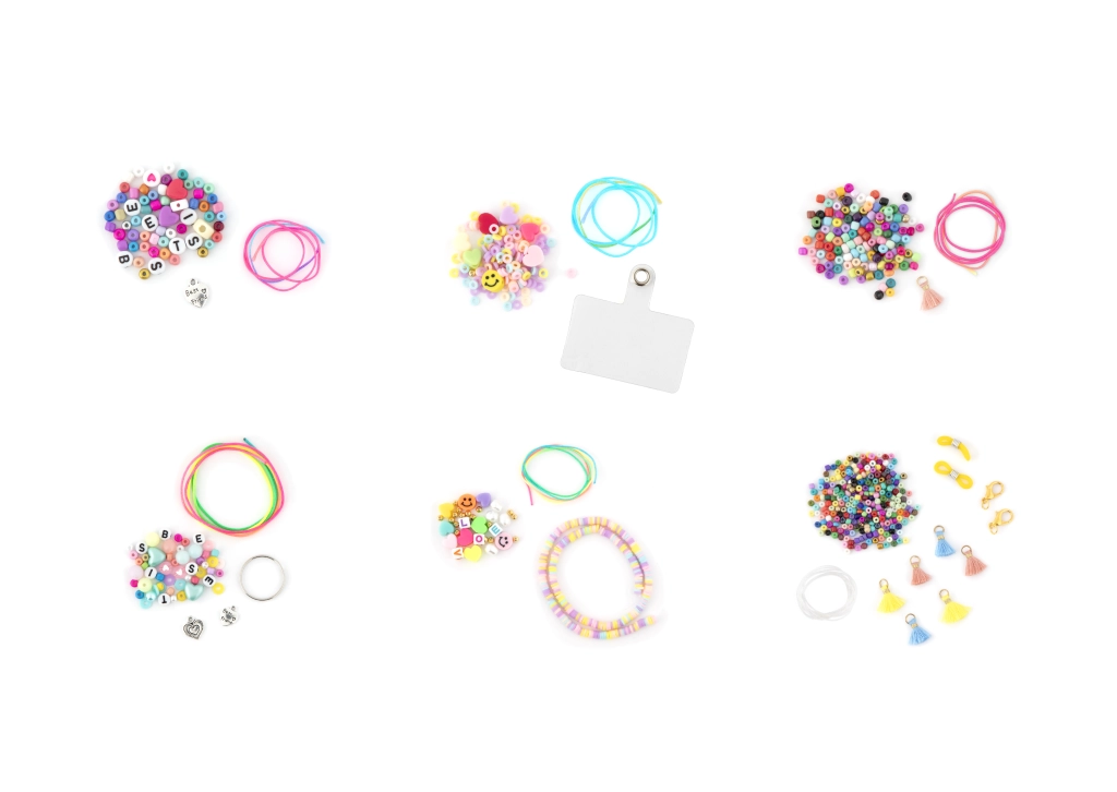 Sættet indeholder et farverigt udvalg af perler, bogstavterninger, vedhæng, ringe og snore – ideelt til armbånd, nøgleringe og brillesnore.
