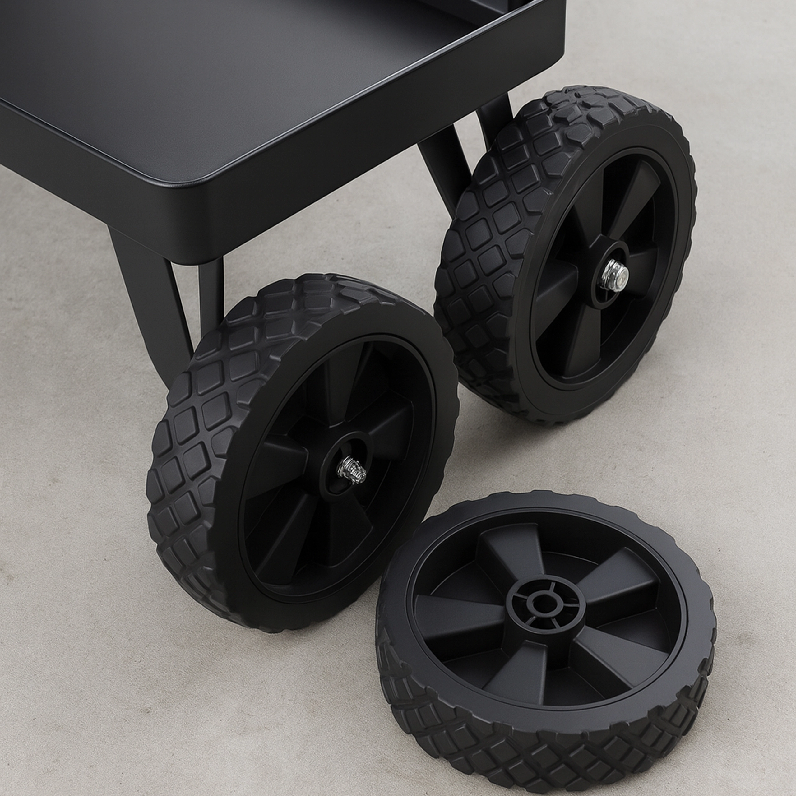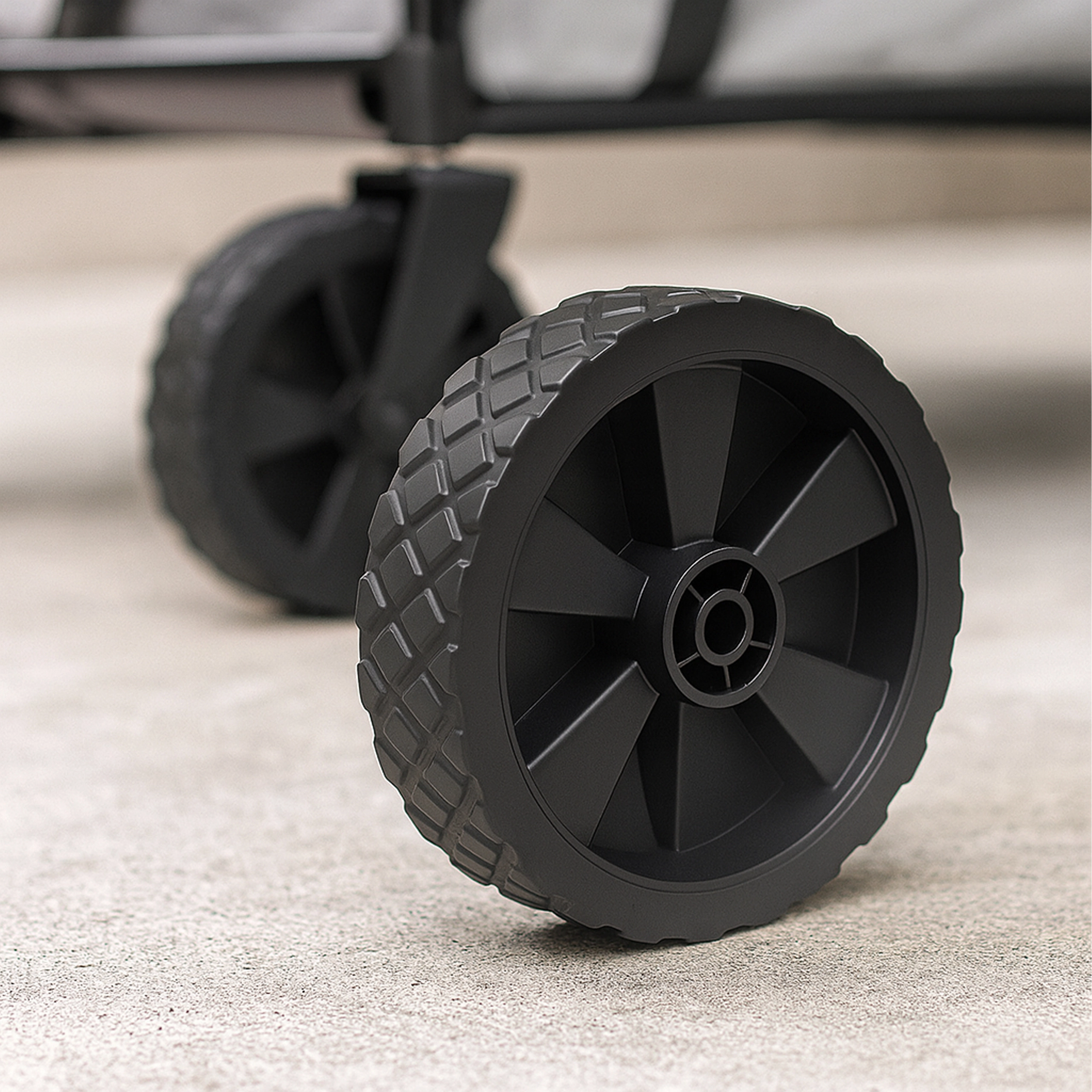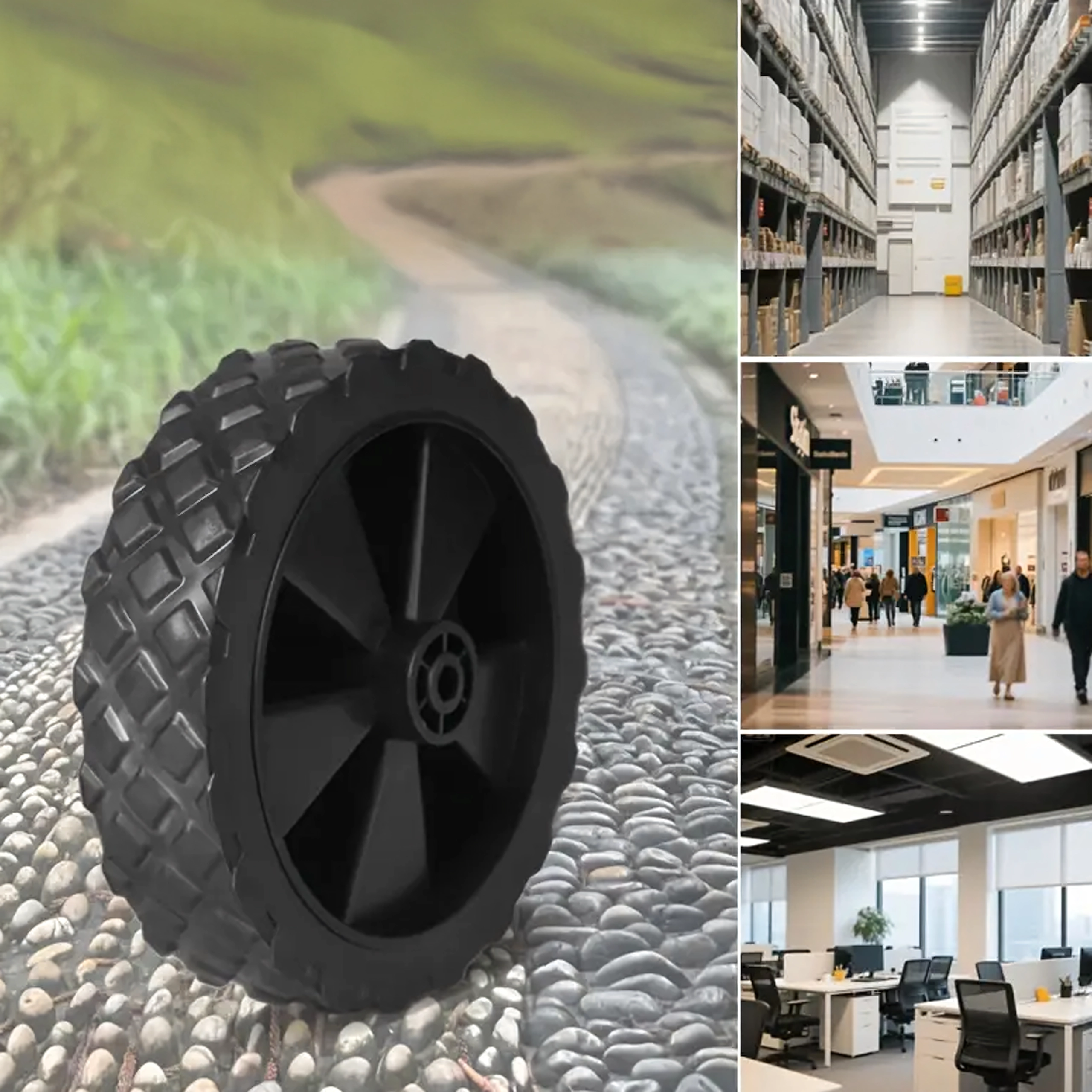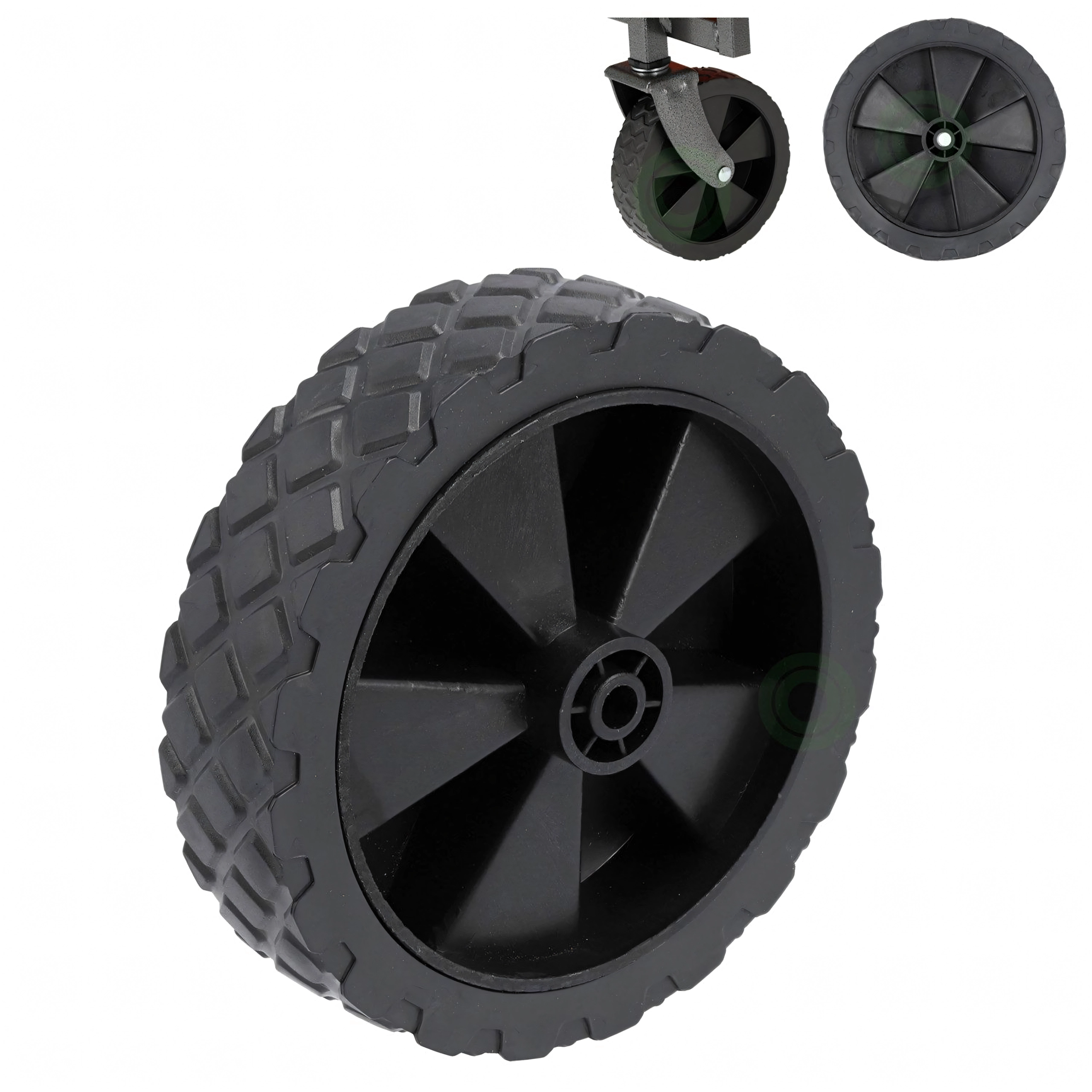 PVC-materialet modstår fugt og skiftende vejr, så hjulet er velegnet til helårsbrug til sammenklappelige vogne, håndtrukne kærrer, have- og transportvogne. En hurtig og økonomisk løsning, der forlænger levetiden på dit udstyr.