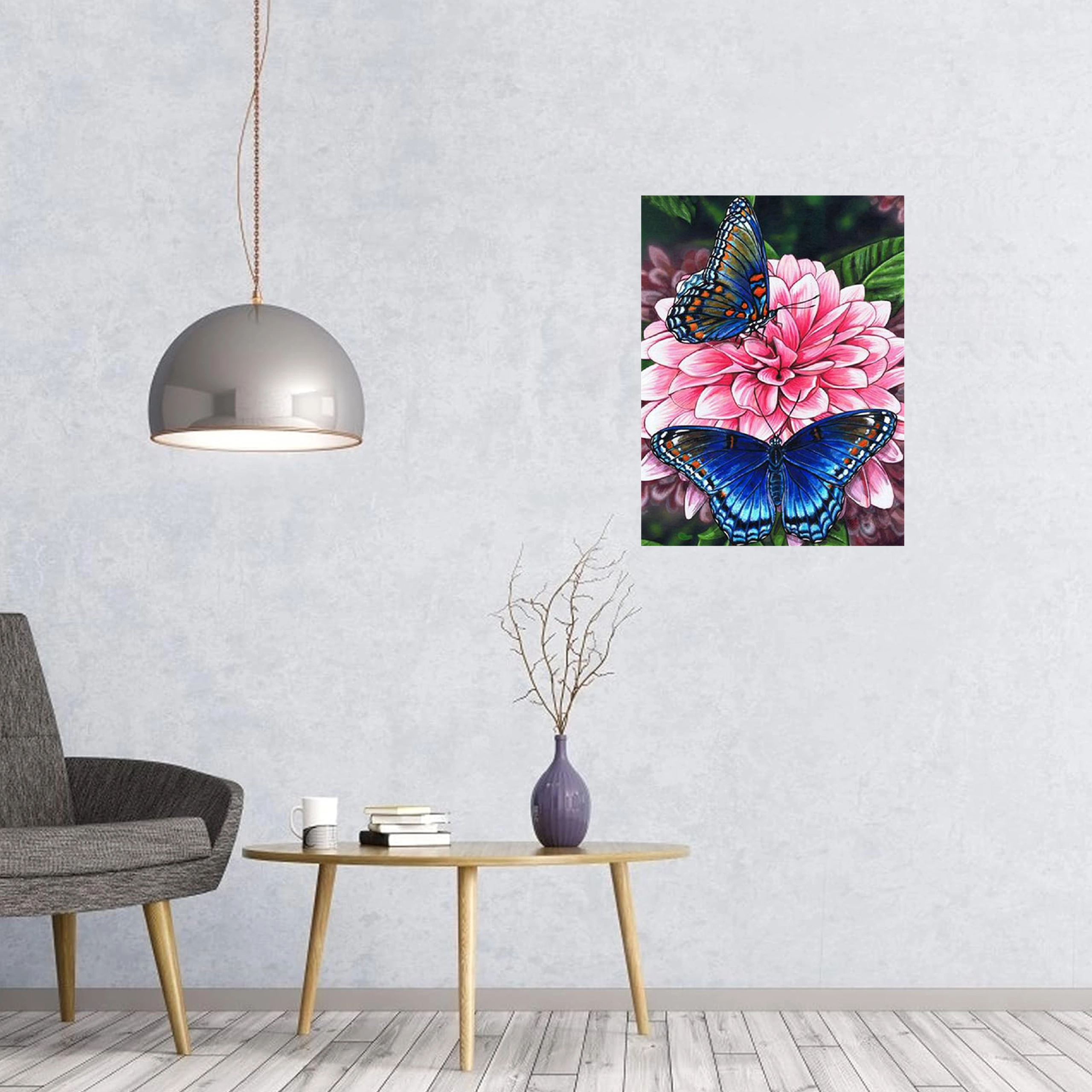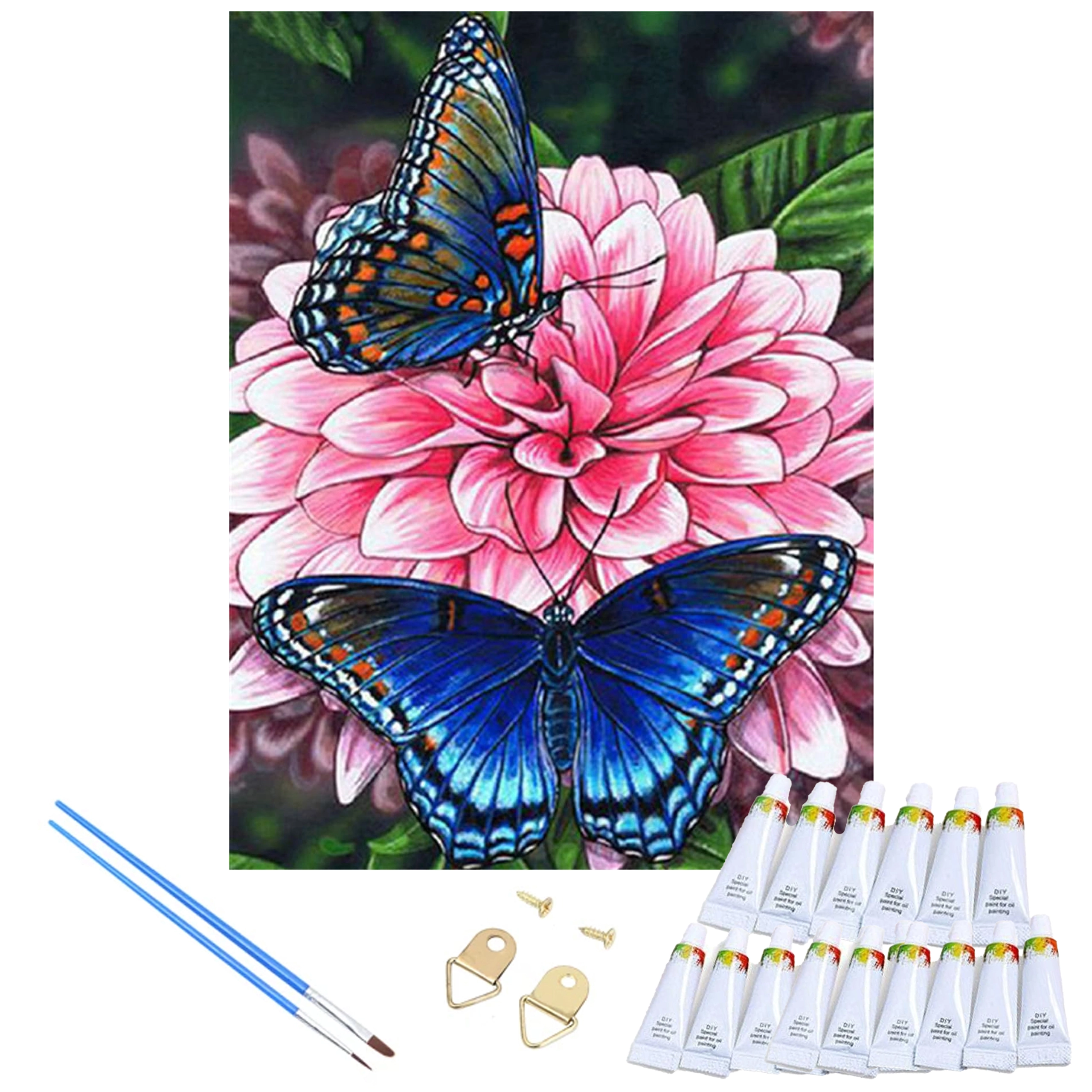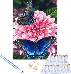 Motivet med to blå sommerfugle på en blomst er trykt på et lærred opspændt på en træramme. Når maleriet er færdigt, hænger du det blot op og forskønner din indretning.