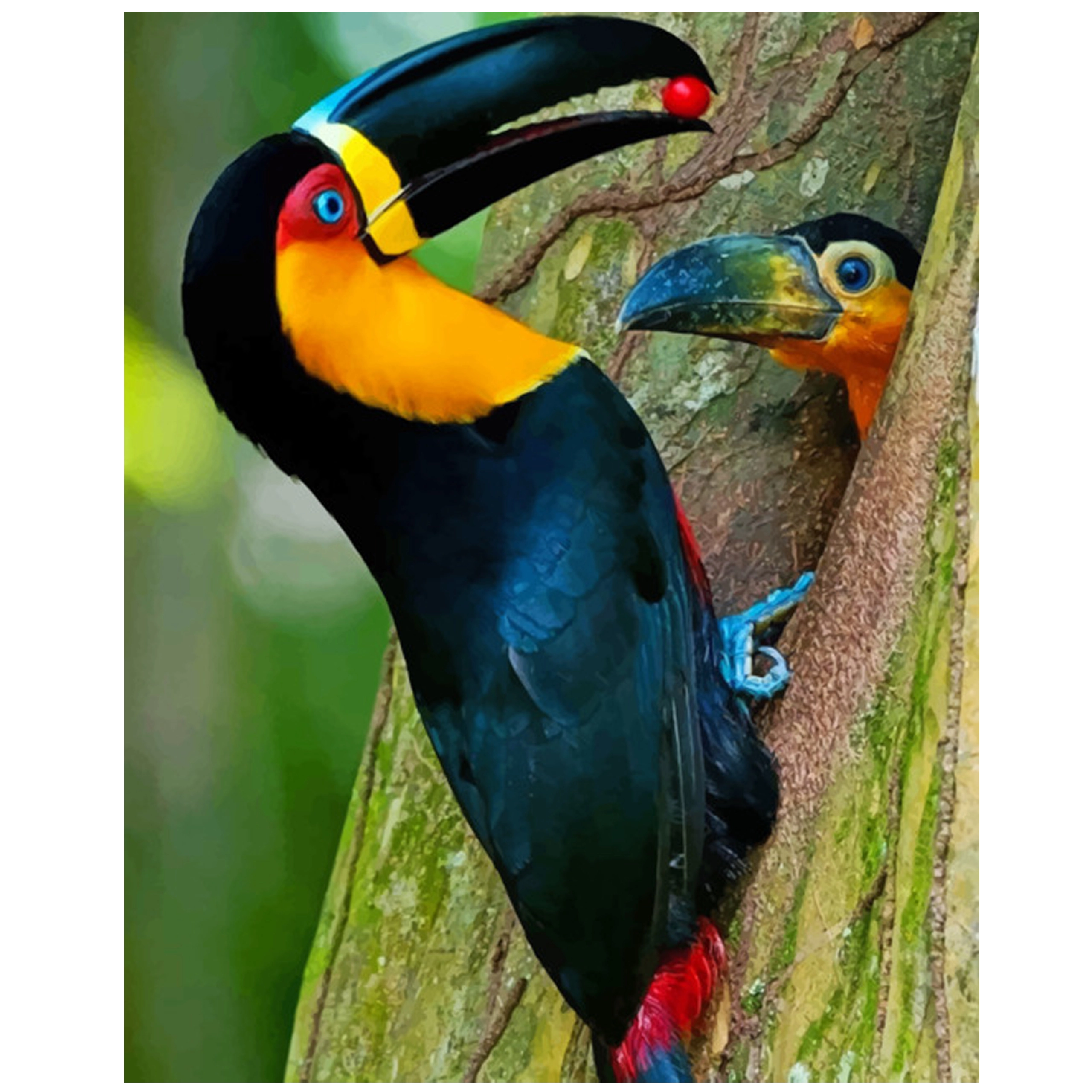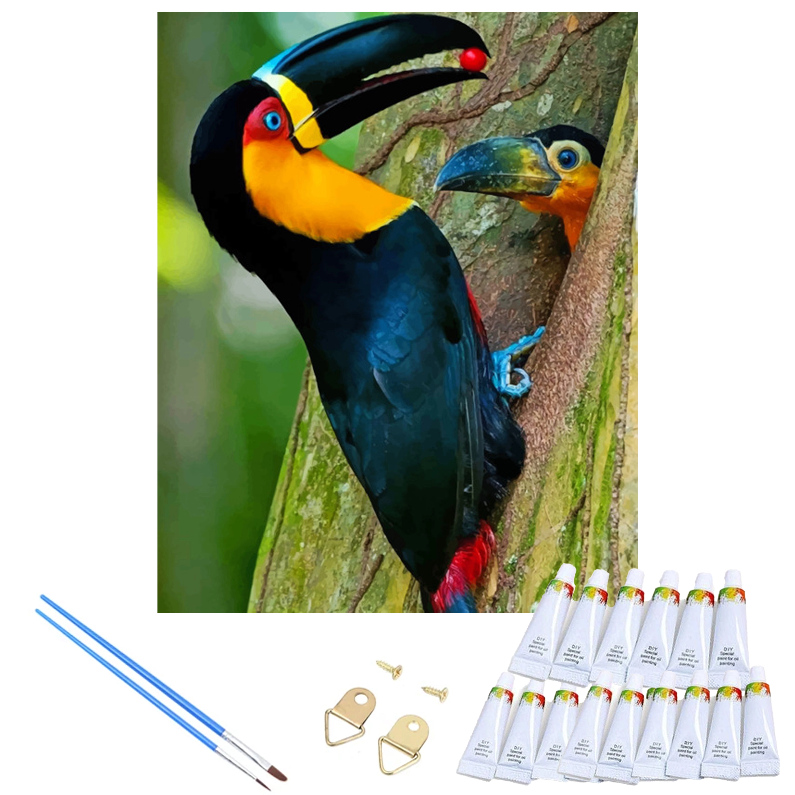 Dette komplette DIY-sæt gør det muligt at skabe et imponerende billede med motiv af en eksotisk tukan uden forudgående erfaring. Hvert nummereret felt på lærredet svarer til en bestemt farvetone, hvilket sikrer nem, sjov og afslappende maling. Takket være opspændingen på en træ-blindramme kan du begynde straks efter udpakning og hænge det færdige værk op med det samme.