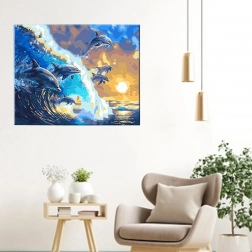 En energisk scene med delfiner i solnedgang fremhæves af kontrasten mellem blå og orange toner og forvandler dit hjem til et hyggeligt sted.