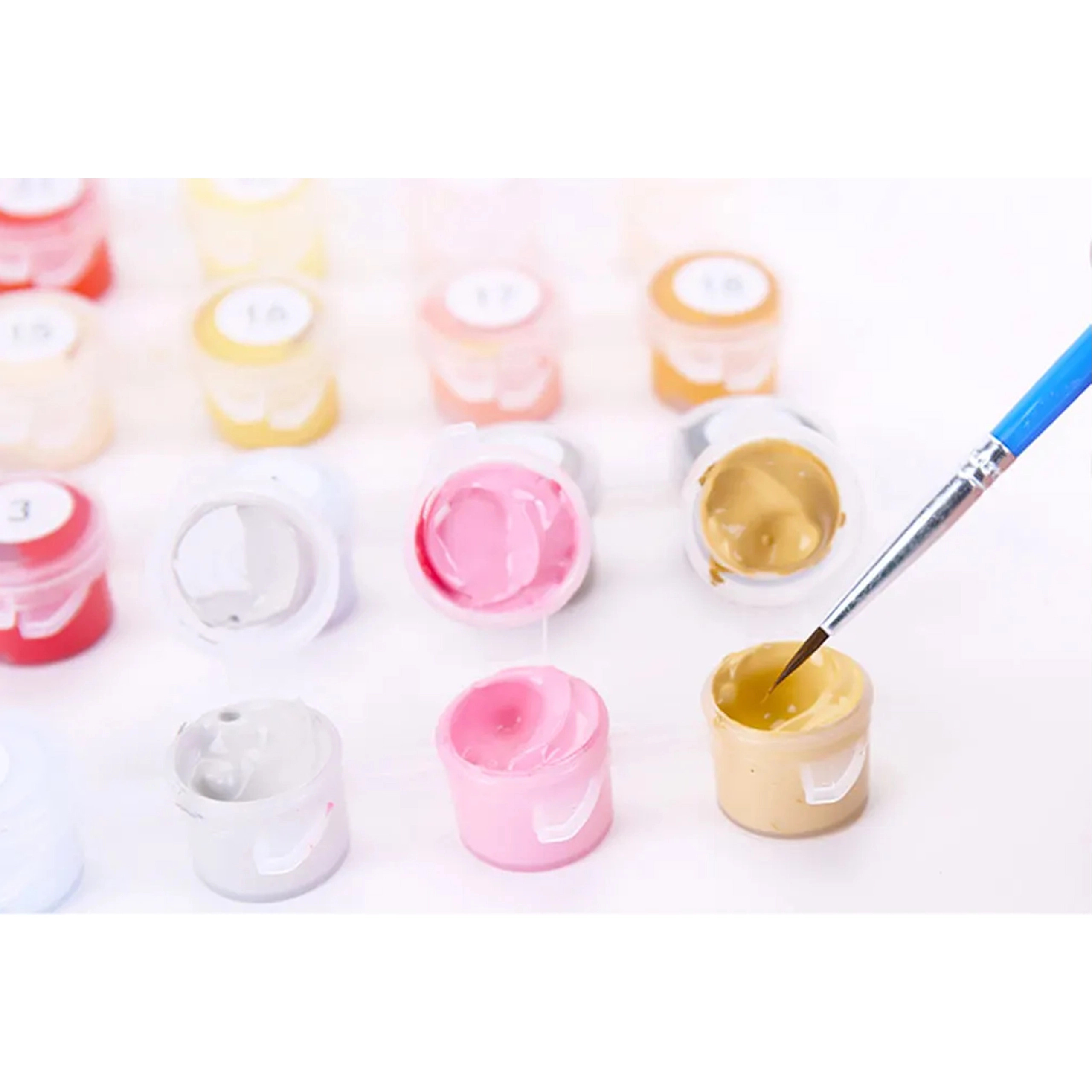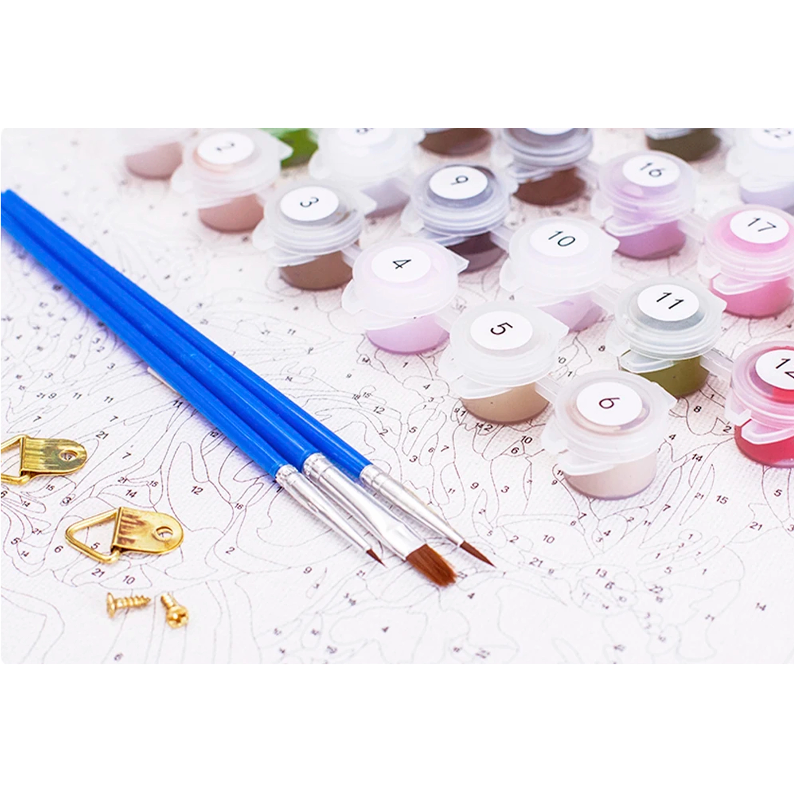 Nummereret lærred, akrylfarver og pensler – begynd at male straks efter udpakning. Hvert tal svarer præcist til en farve for et perfekt resultat.