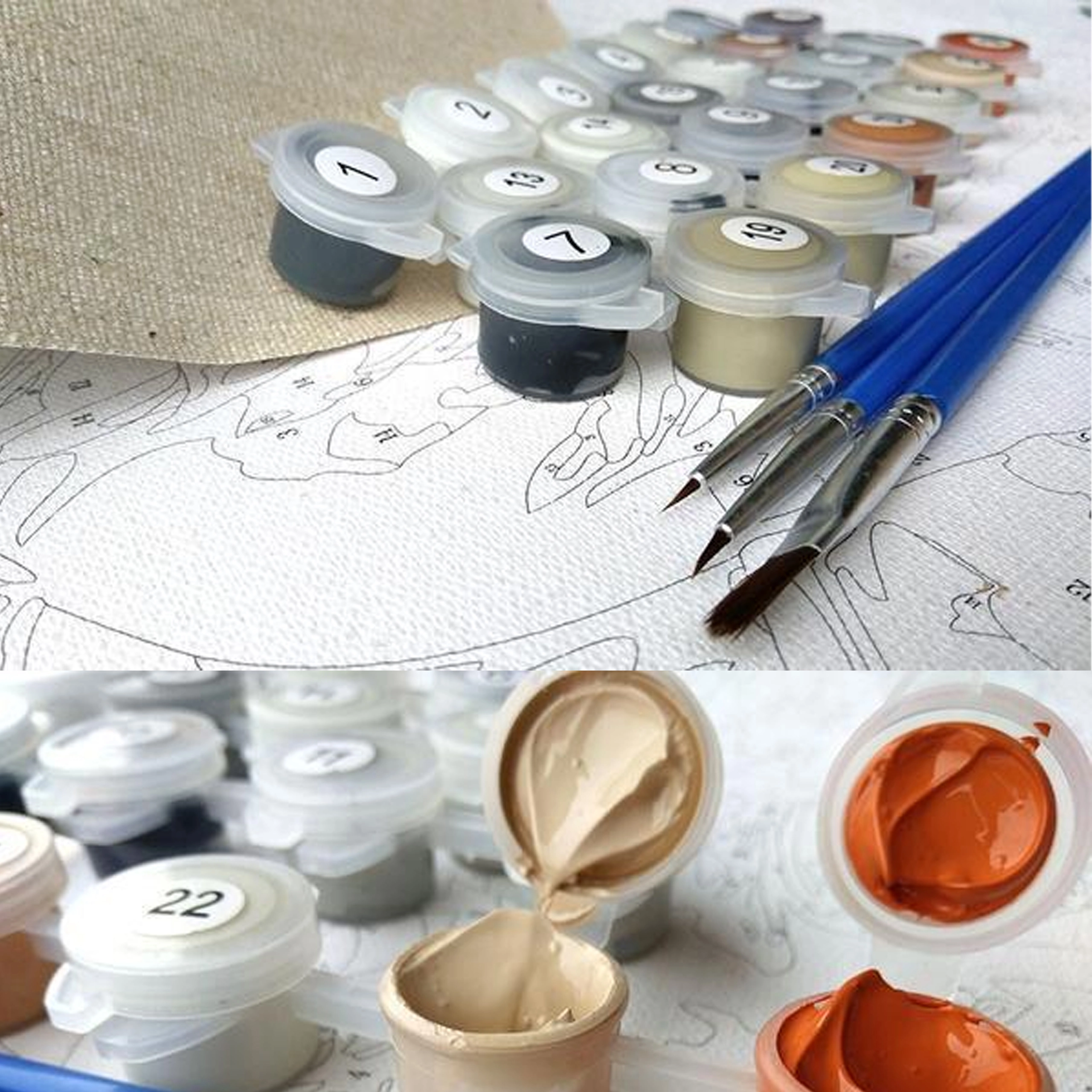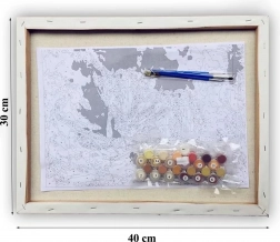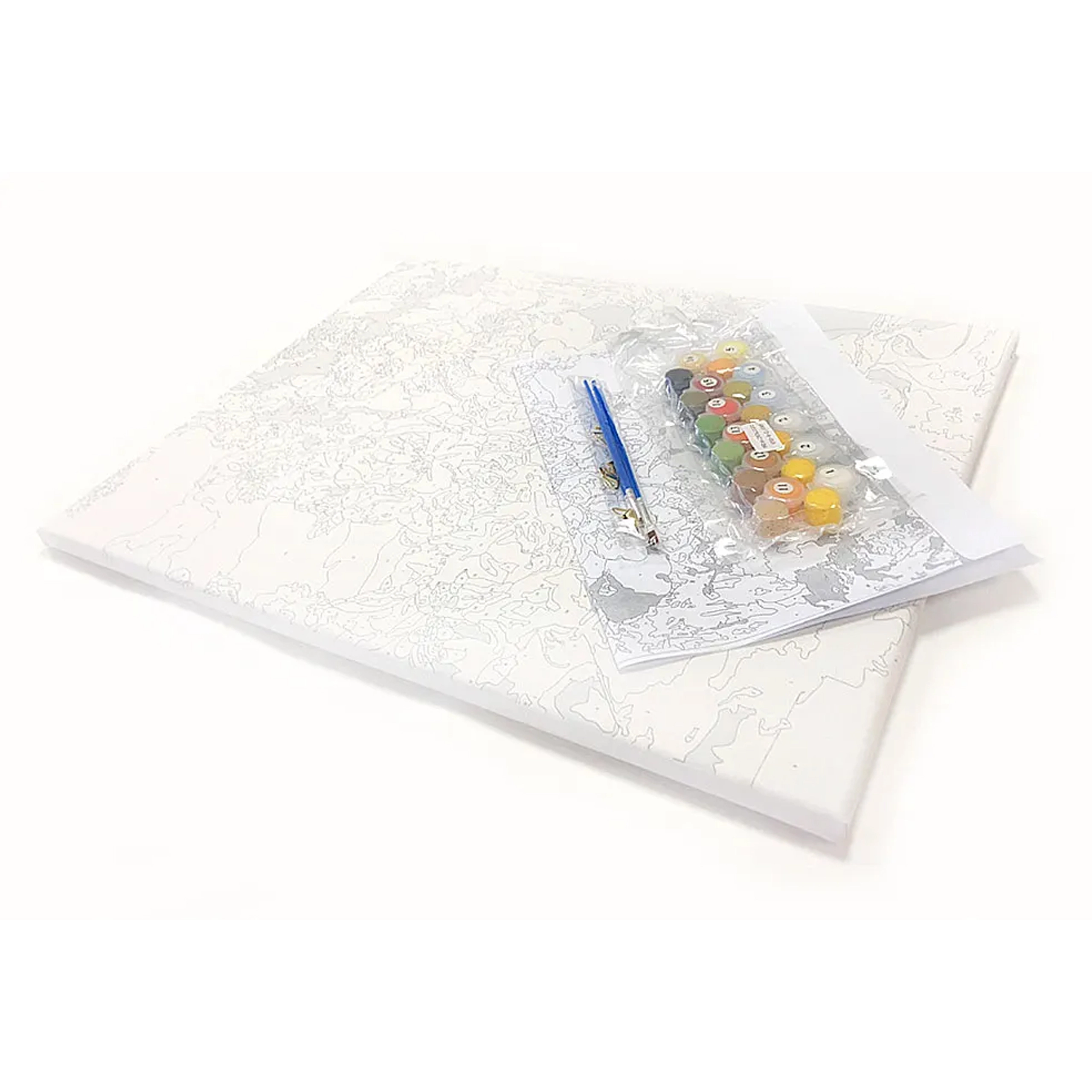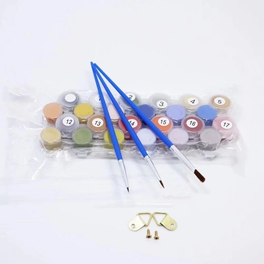 I pakken finder du alt, hvad du skal bruge – fortrykt lærred, et sæt farver i beholdere, pensler og en referenceskabelon for et sikkert resultat.