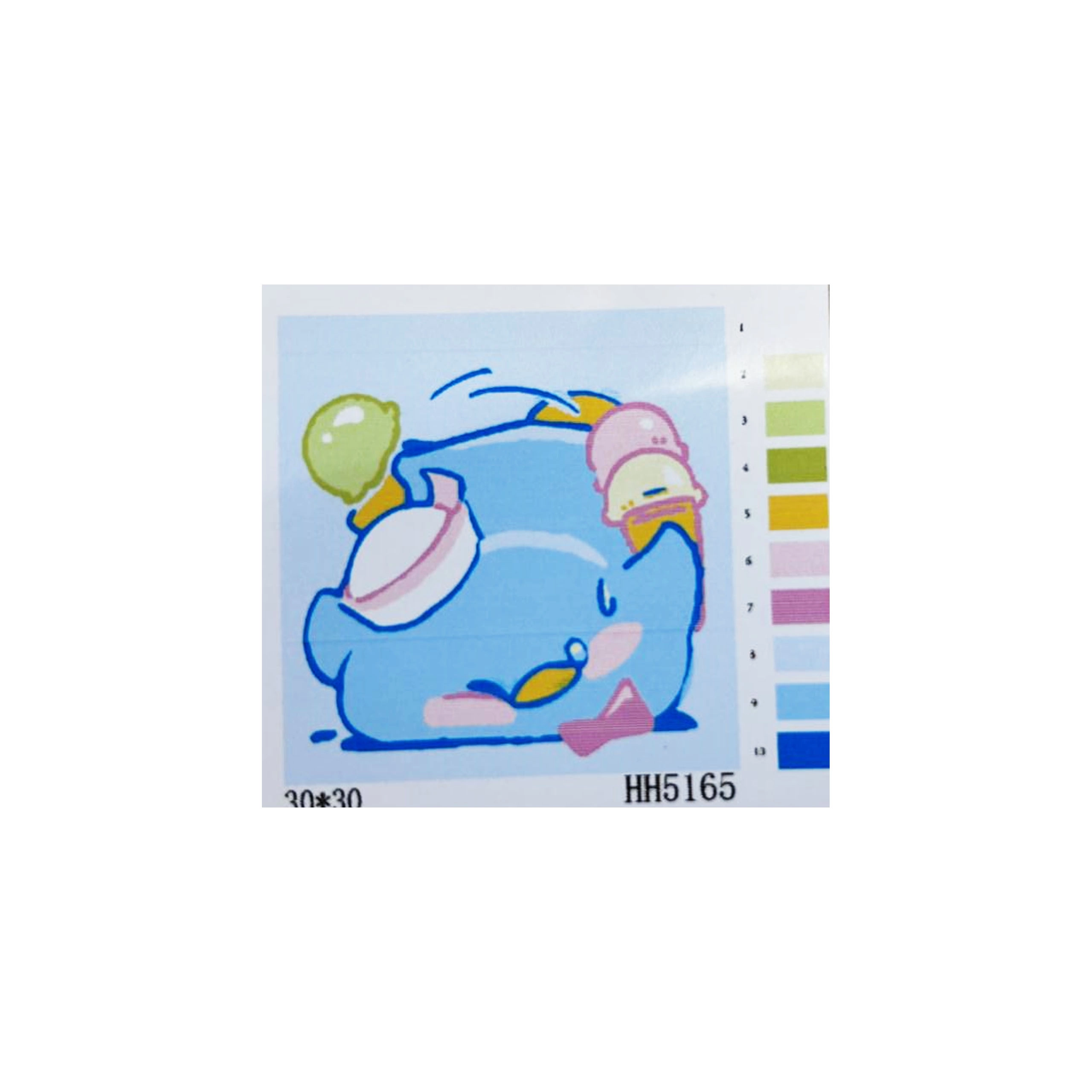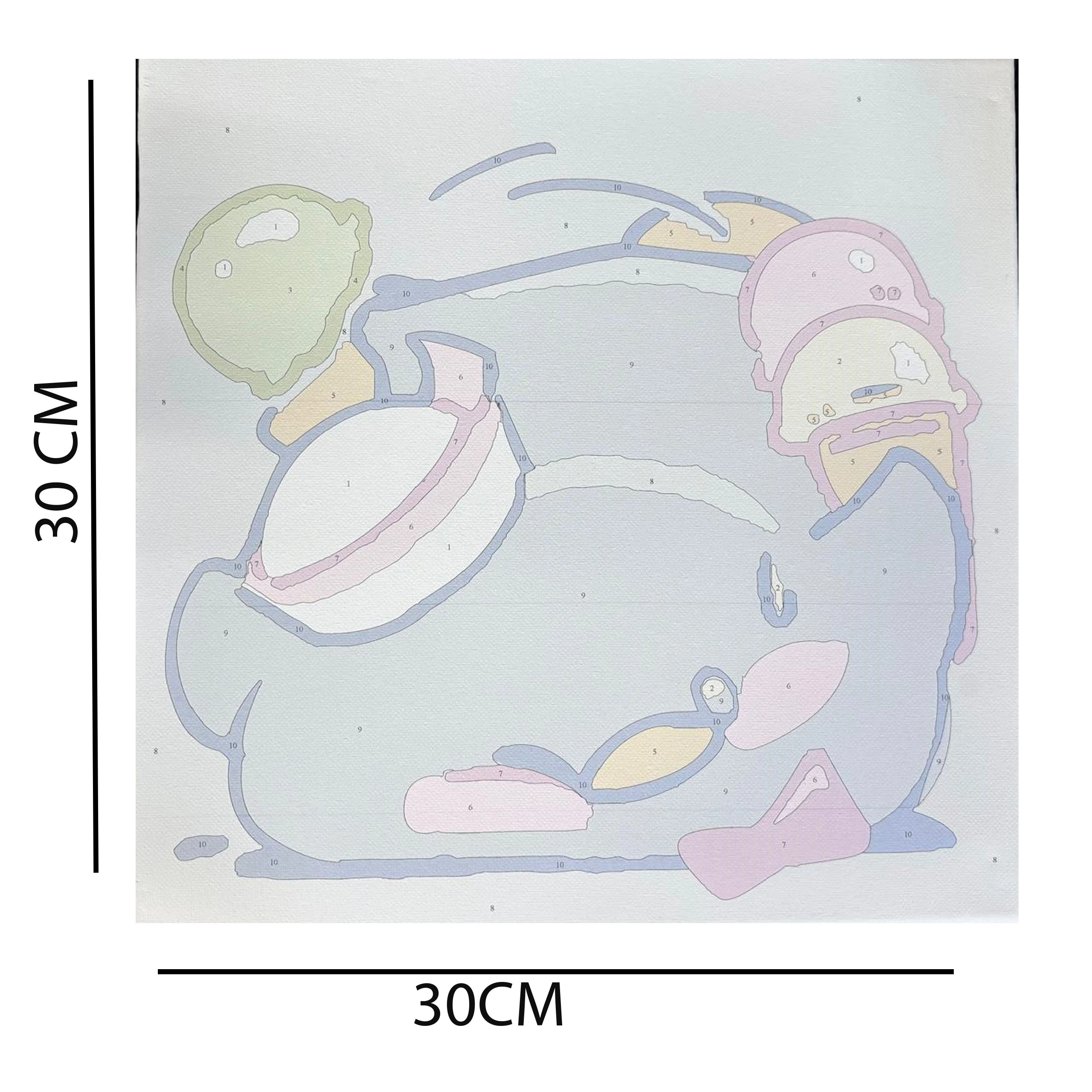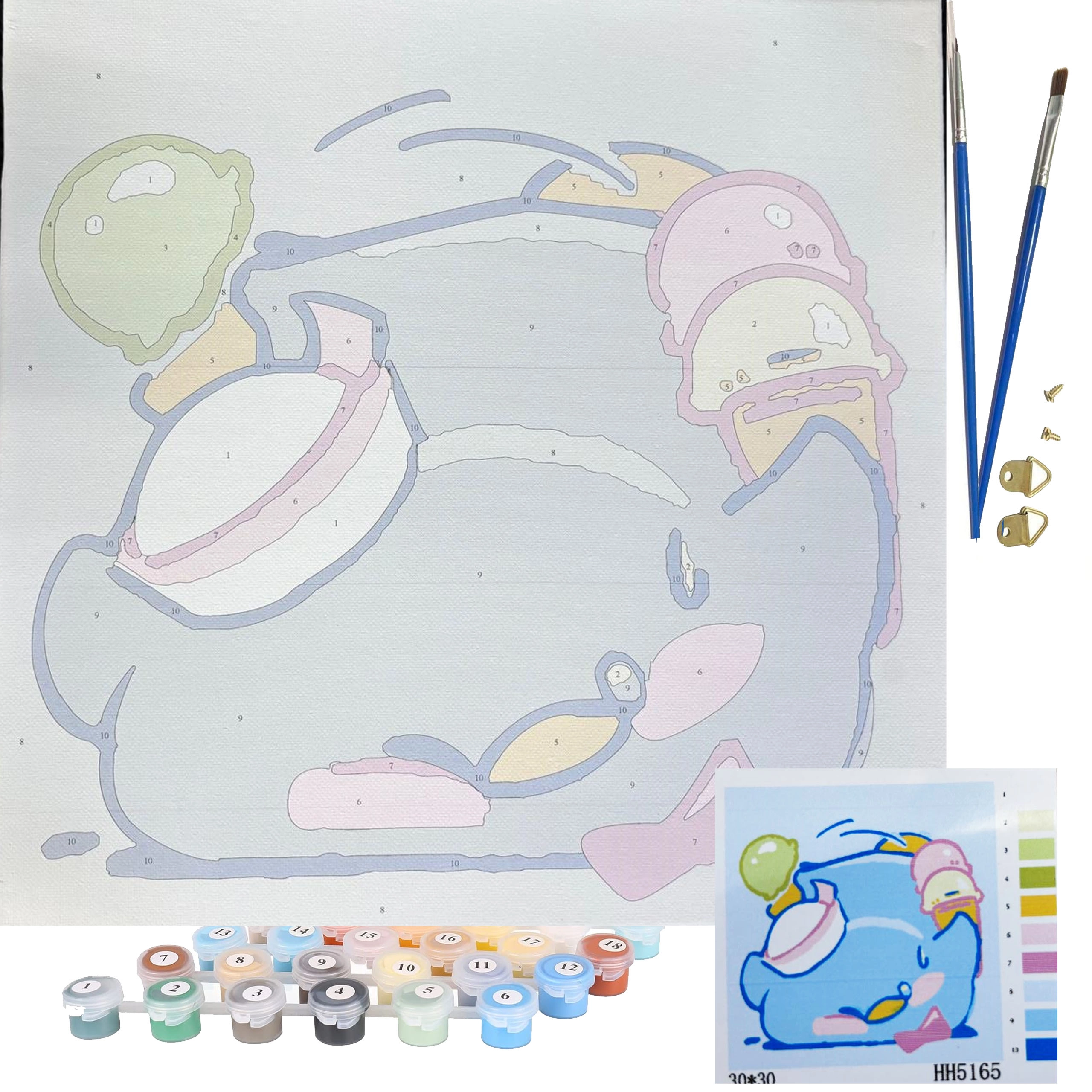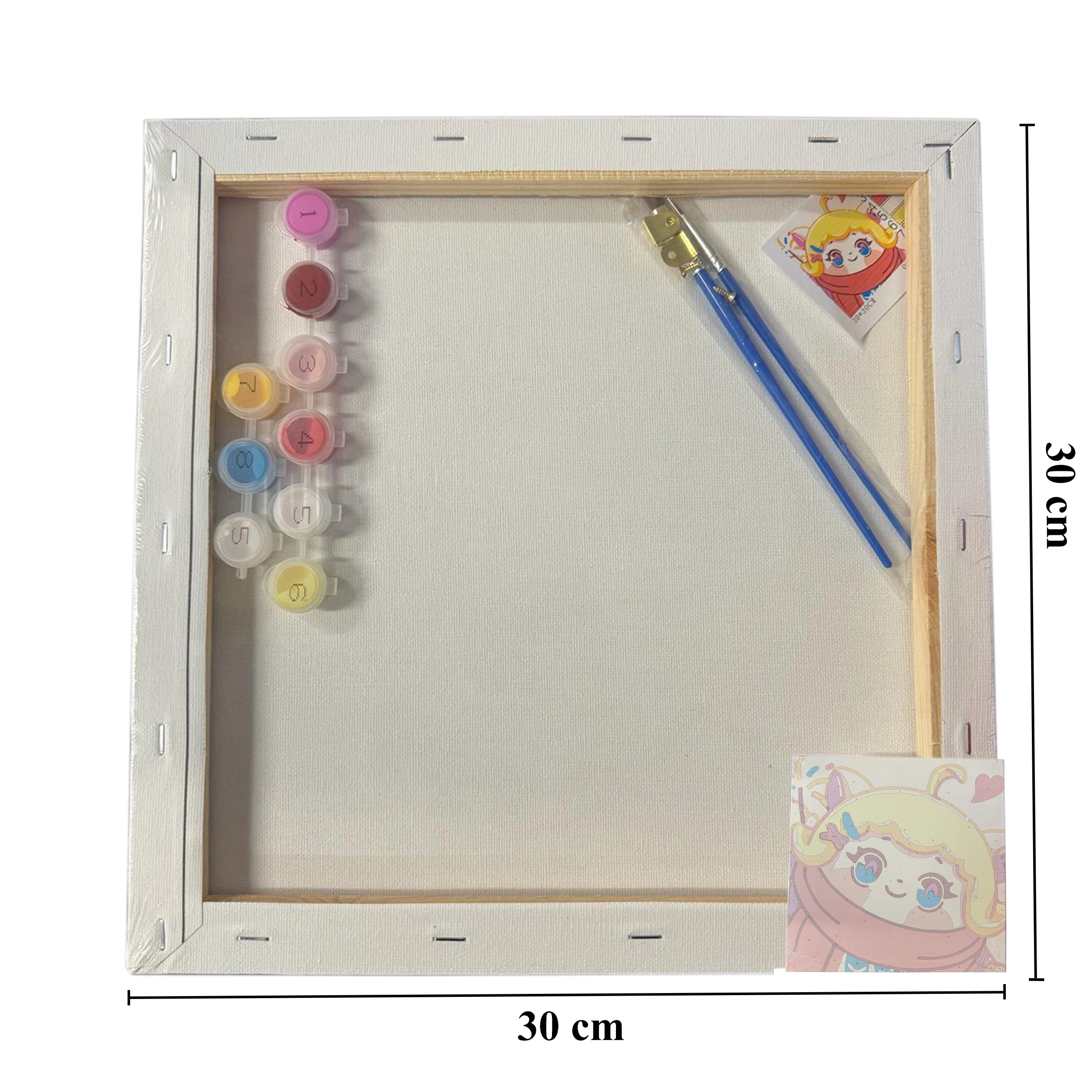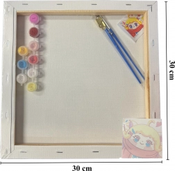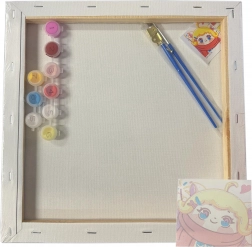 Sættet er designet til et børnevenligt sværhedsniveau og indeholder alt nødvendigt: fortrykt lærred 30 × 30 cm, sæt akrylfarver og pensler. Mønster og farver sendes tilfældigt med fokus på børnemotiver, så maleriet er sjovt og tilgængeligt.