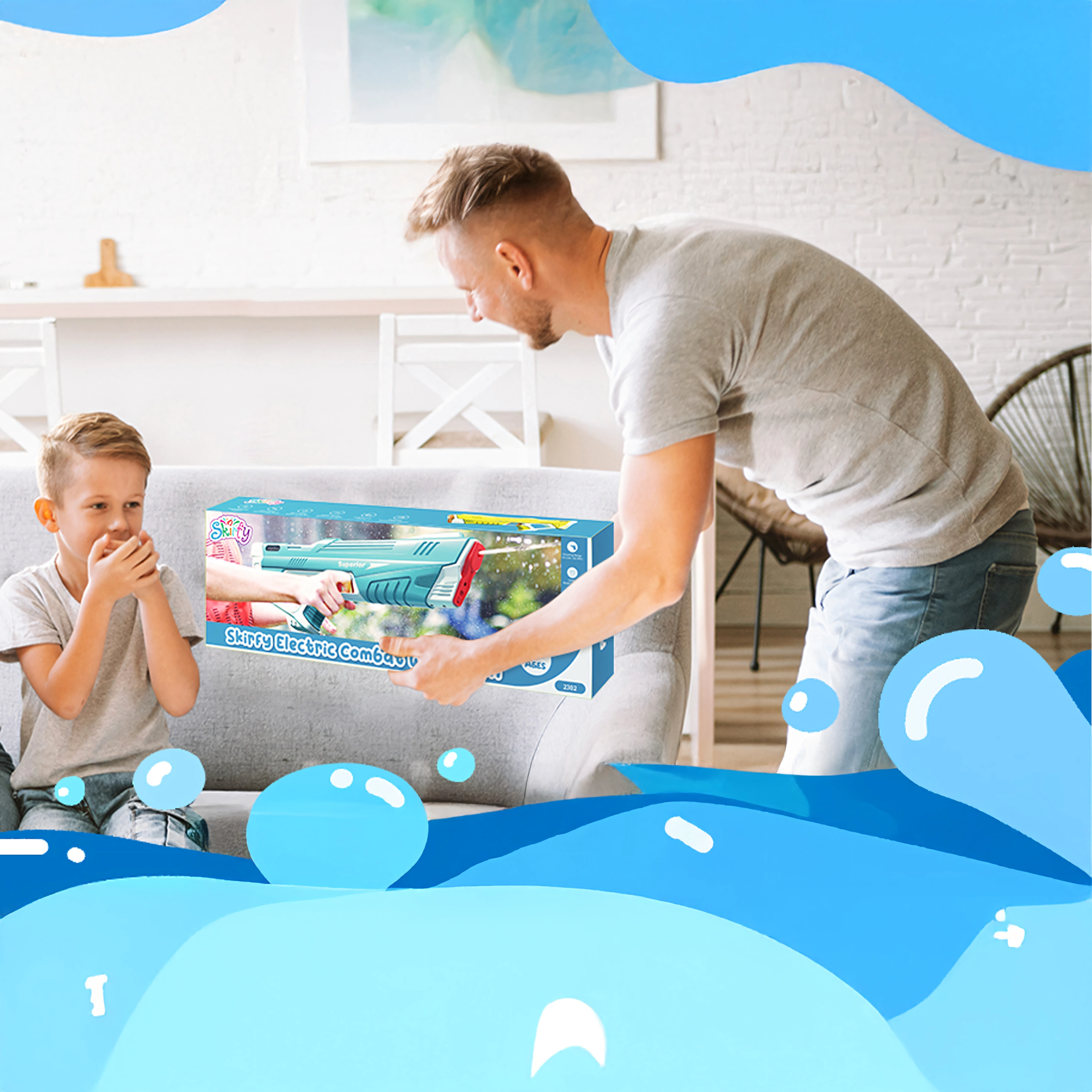 Den indbyggede motor sikrer hurtig og jævn vandstråle – tryk blot på aftrækkeren, og så begynder legen.