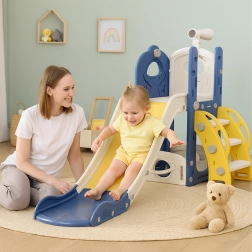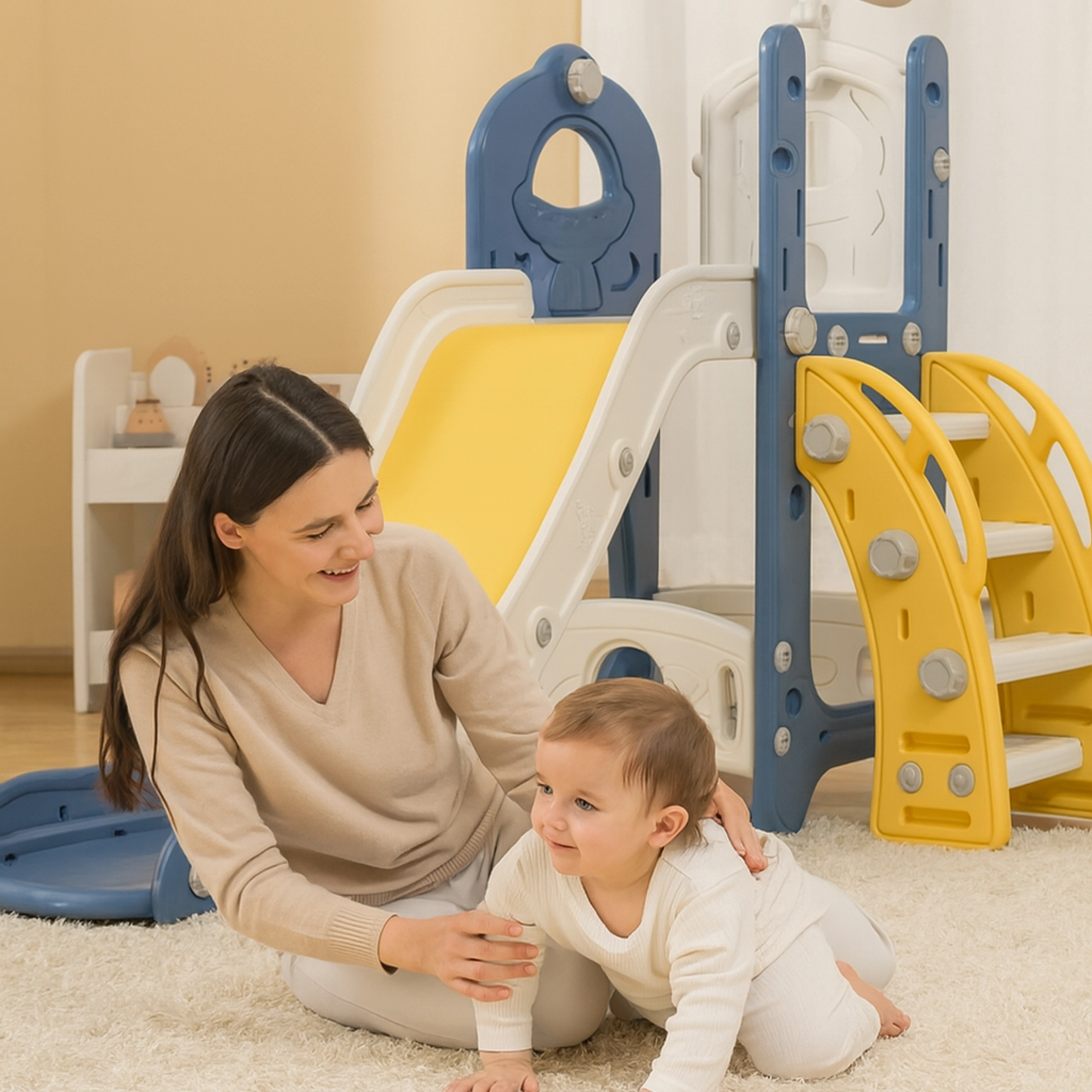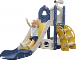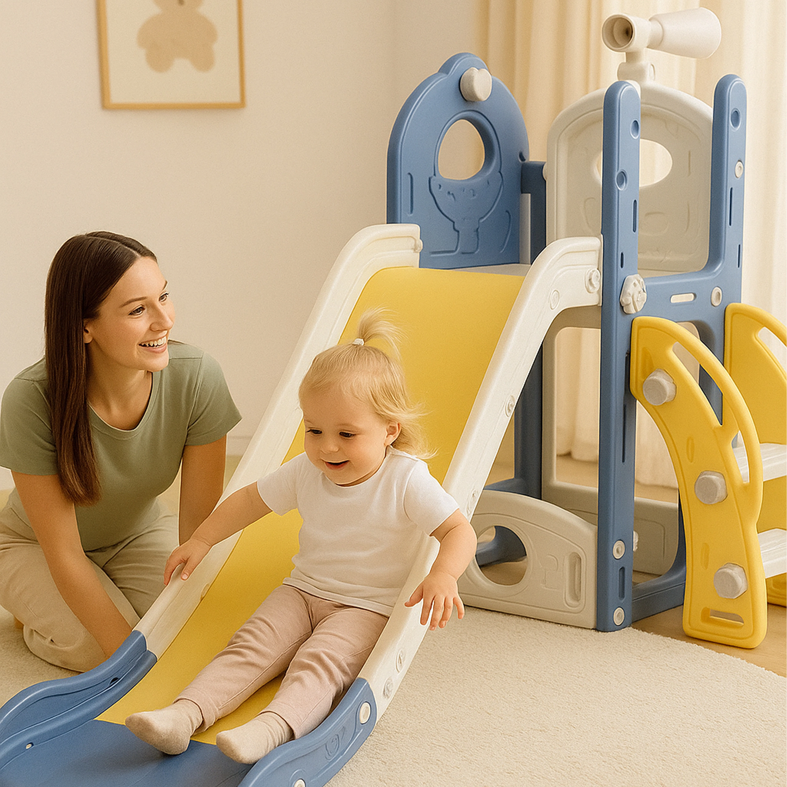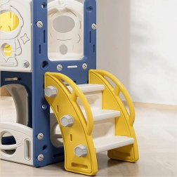 Sættet indeholder sjovt tilbehør – en basketkurv til de første scoringer og et teleskop til små opdagelsesrejsende. Rutsjebanen er nem at vedligeholde, velegnet til daglig leg og kan takket være de kompakte mål placeres i stuen, børneværelset eller på terrassen. Den er også perfekt sammen med en tør boldpool.