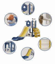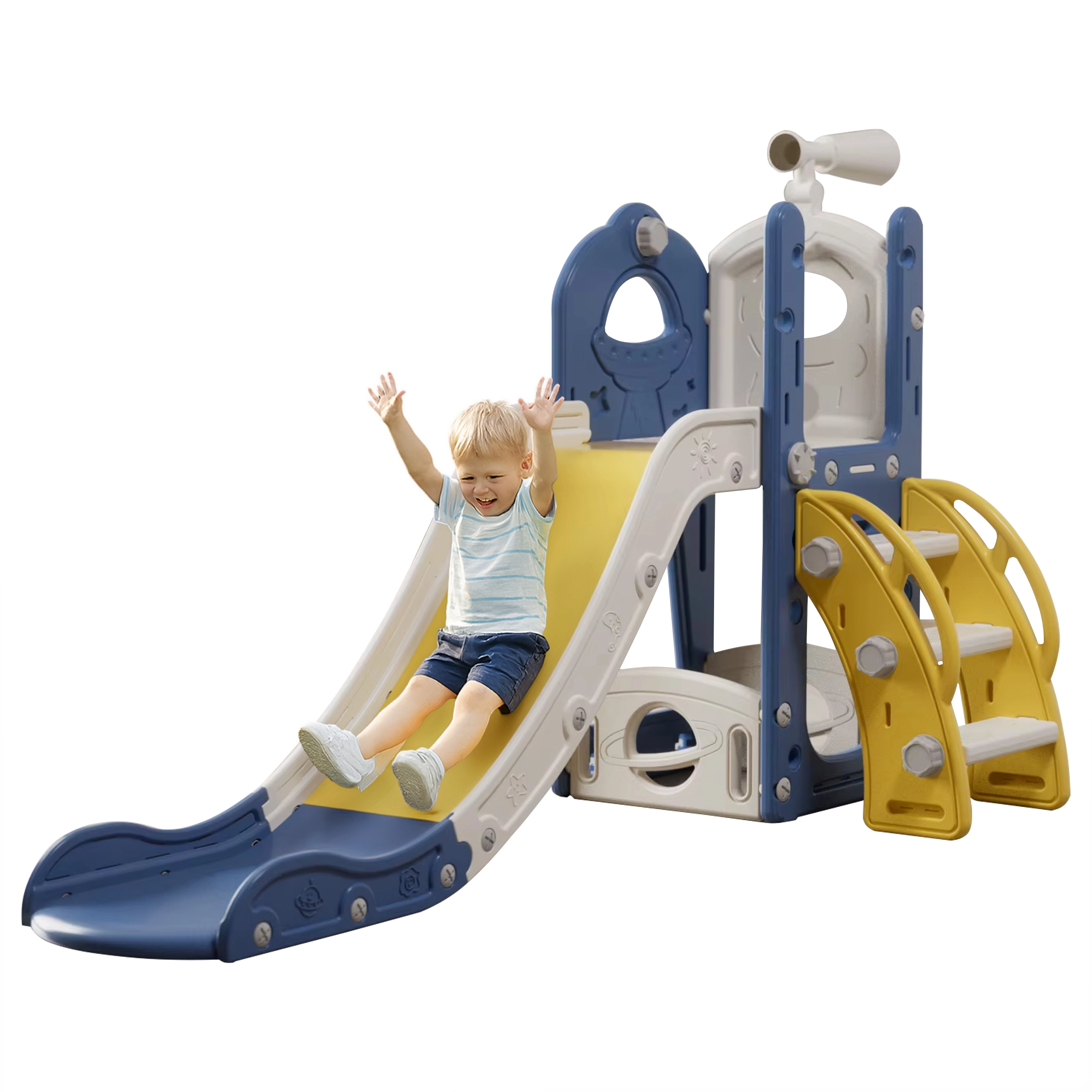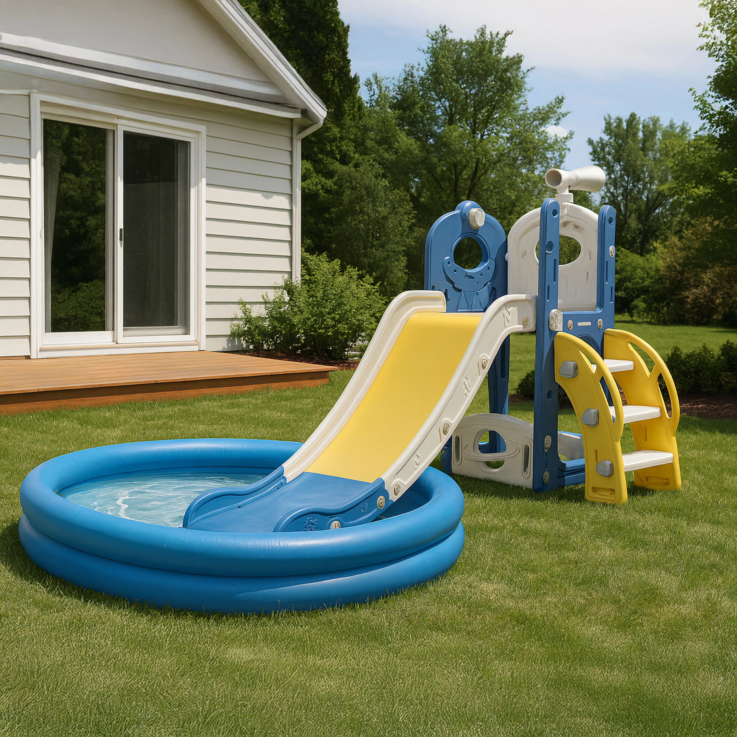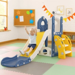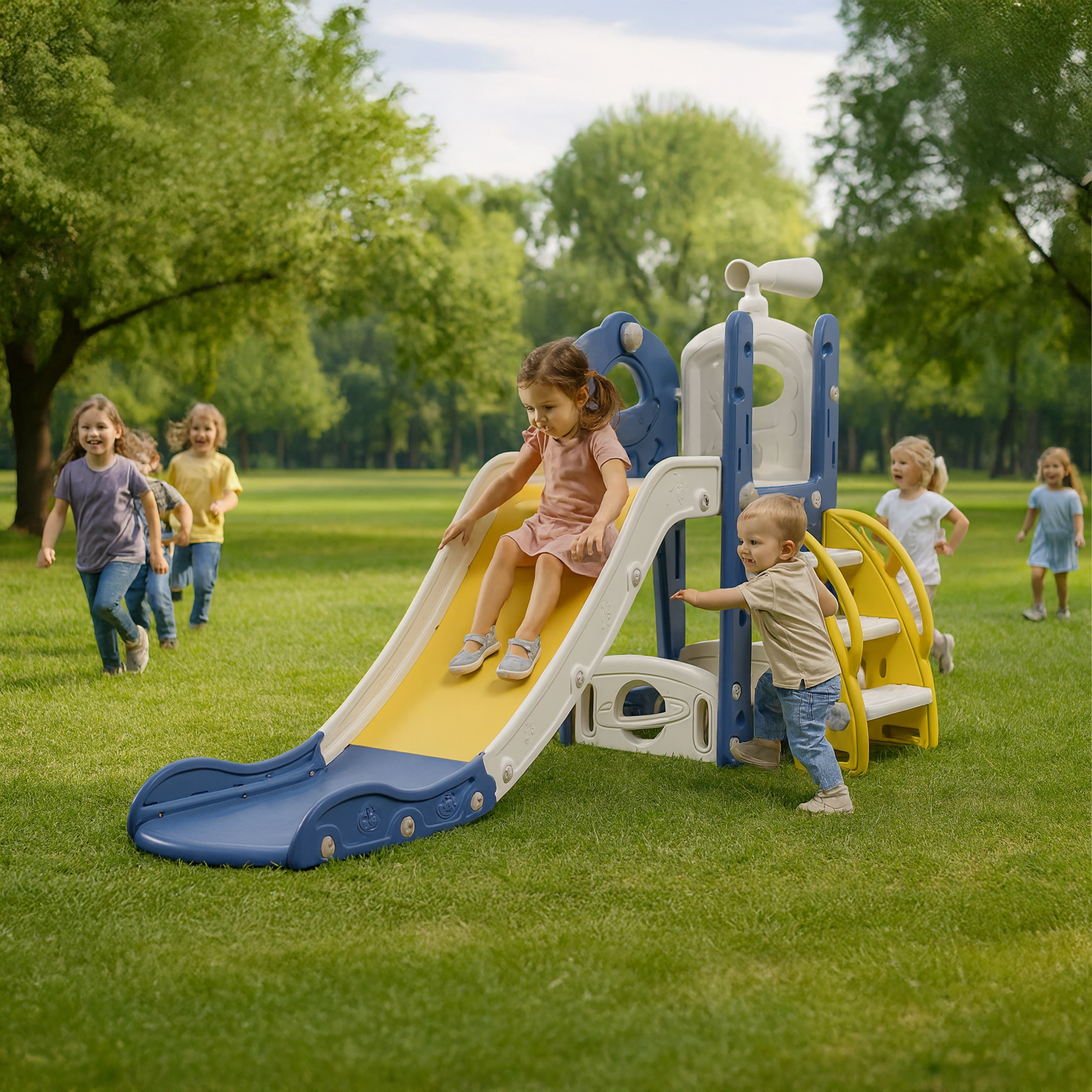 Sættet indeholder sjovt tilbehør – en basketkurv til de første scoringer og et teleskop til små opdagelsesrejsende. Rutsjebanen er nem at vedligeholde, velegnet til daglig leg og kan takket være de kompakte mål placeres i stuen, børneværelset eller på terrassen. Den er også perfekt sammen med en tør boldpool.
