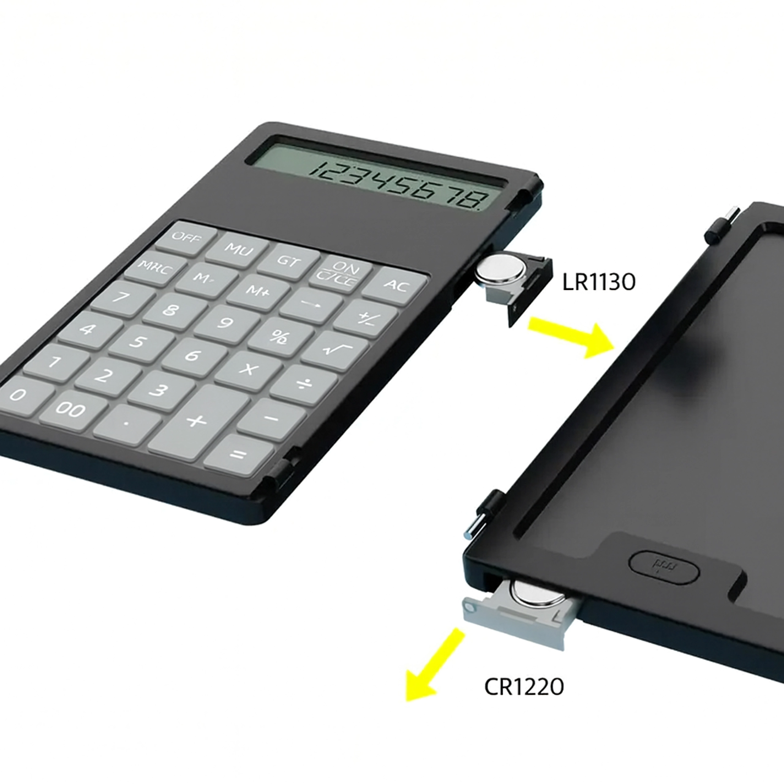 Præcis lommeregner til venstre, LCD-område til hurtige noter til højre – ideel til beregninger, formler og skitser uden papir.