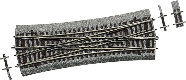 Krydssporskiftet ROCO LINE DKW15 med ballast kombinerer to lige skinner G1 (længde 230 mm), der danner en vinkel på 15° med en afgreningsradius på 1050 mm. Gengiver Bäsler-konstruktionen med ydre tunger og sikrer takket være fuld polarisation en glidende passage selv ved lave hastigheder.