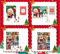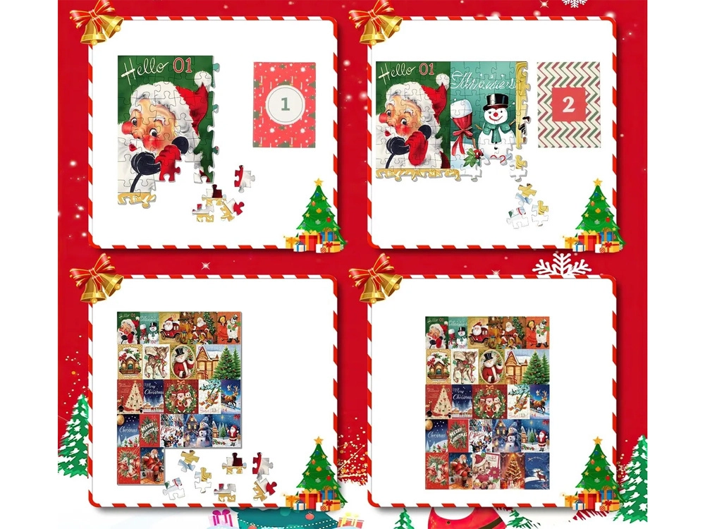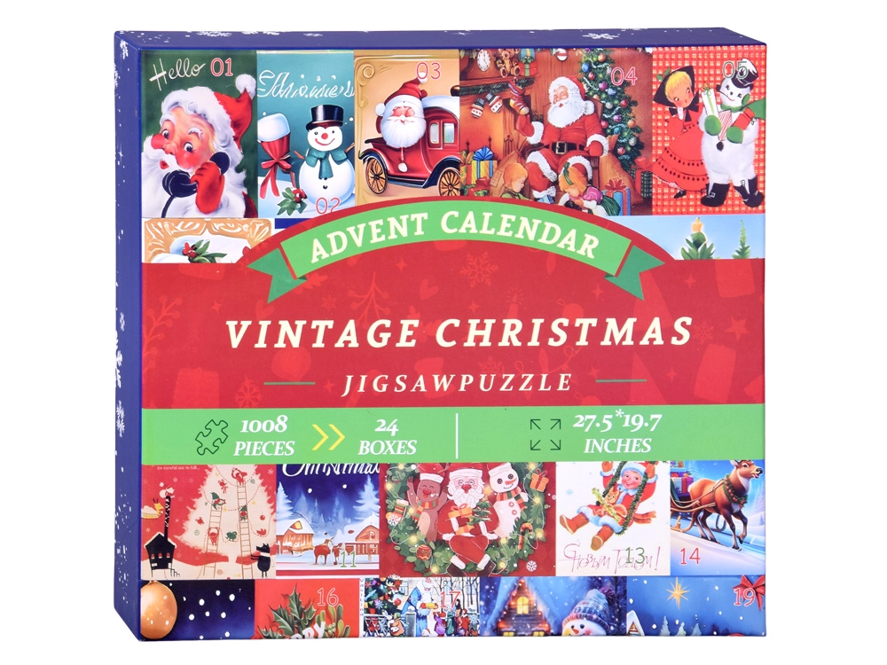Denne adventskalender forener glæden ved nedtællingen til juleaften med den afslappende fornøjelse ved at lægge puslespil. Hver dag åbner du et af de 24 vinduer og får et lille puslespil med et unikt vintage-motiv. Når alle puslespil er lagt, opstår ét samlet billede på 70 × 50 cm, som smukt komplementerer julepynten.