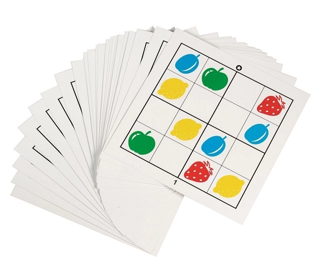Børn placerer brikkerne, så symbolerne ikke gentages i rækker, kolonner eller firkanter – den perfekte start på sudokuens verden.