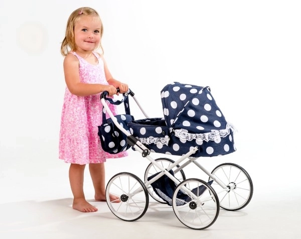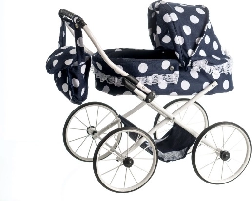 En stilfuld dukkevogn i retrodesign, der vil glæde enhver lille mor. Den tilbyder sort udførsel med prikker og elegant blonde, justerbart håndtag 55 cm for behagelig styring og nedfældelig kaleche for nem håndtering. Inkluderer taske over håndtaget og praktisk underkurv til småting.
