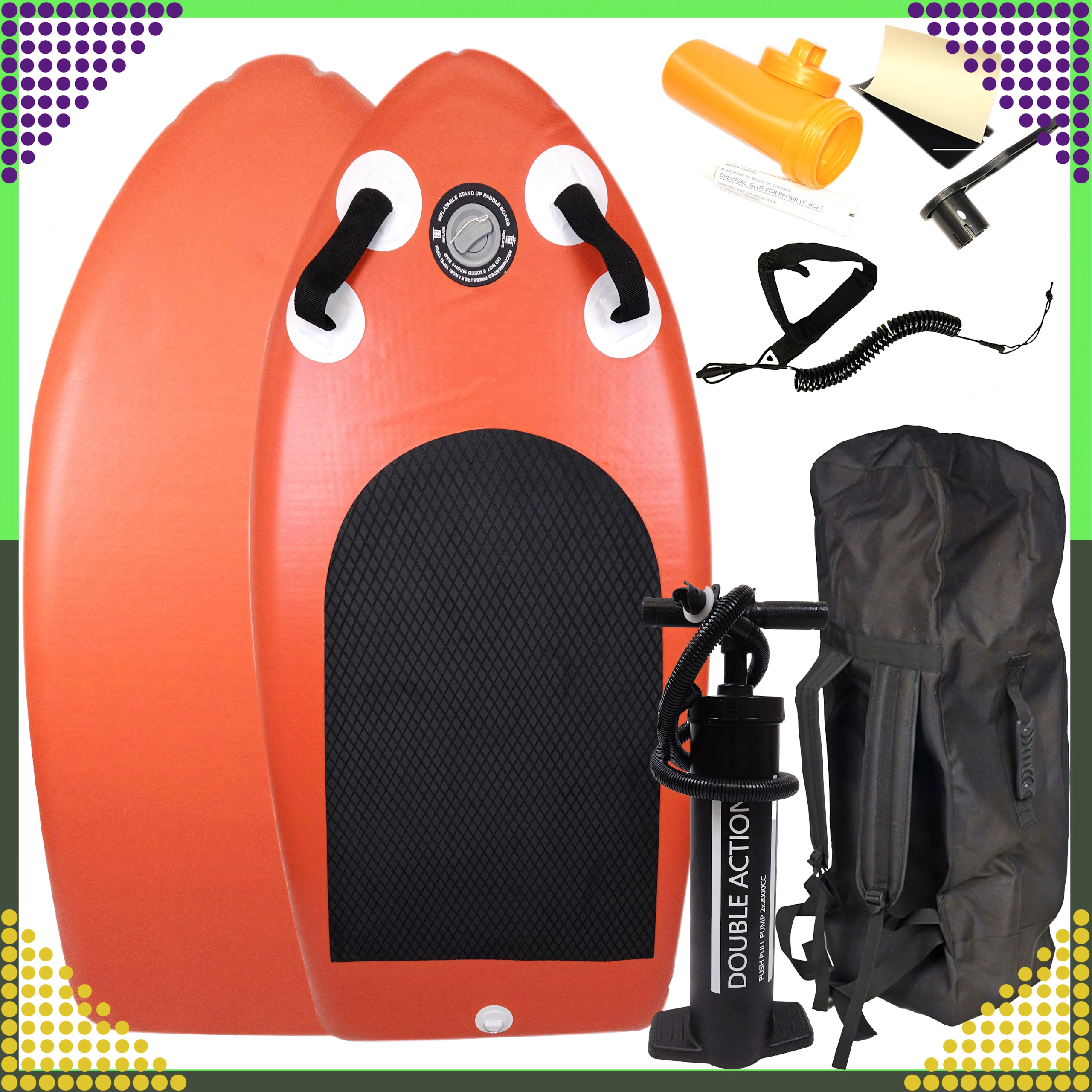 I pakken finder du alt, hvad du behøver: dobbeltvirkende pumpe, spiral-leash, reparationssæt, ventiladapter og en rummelig rygsæk til nem transport.
