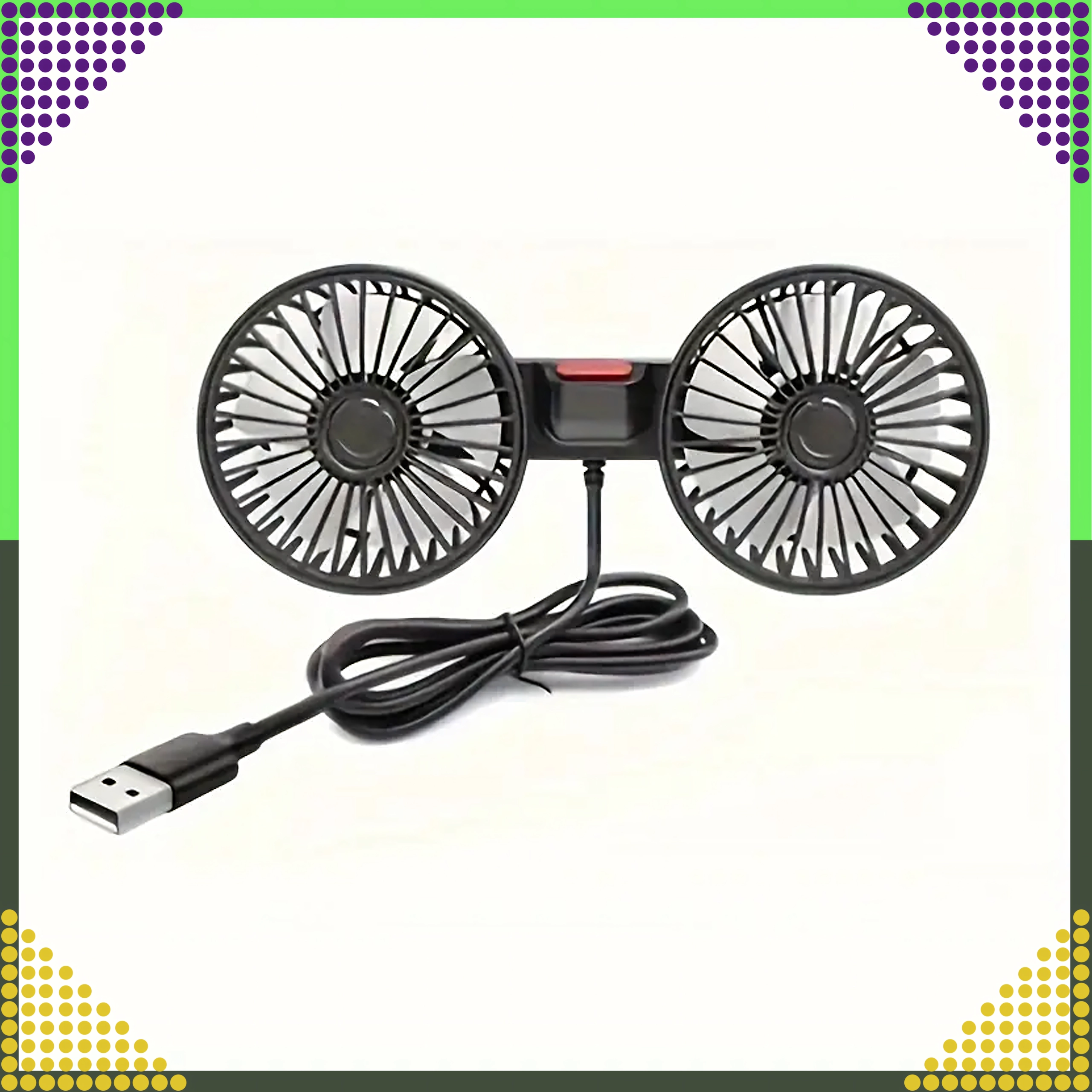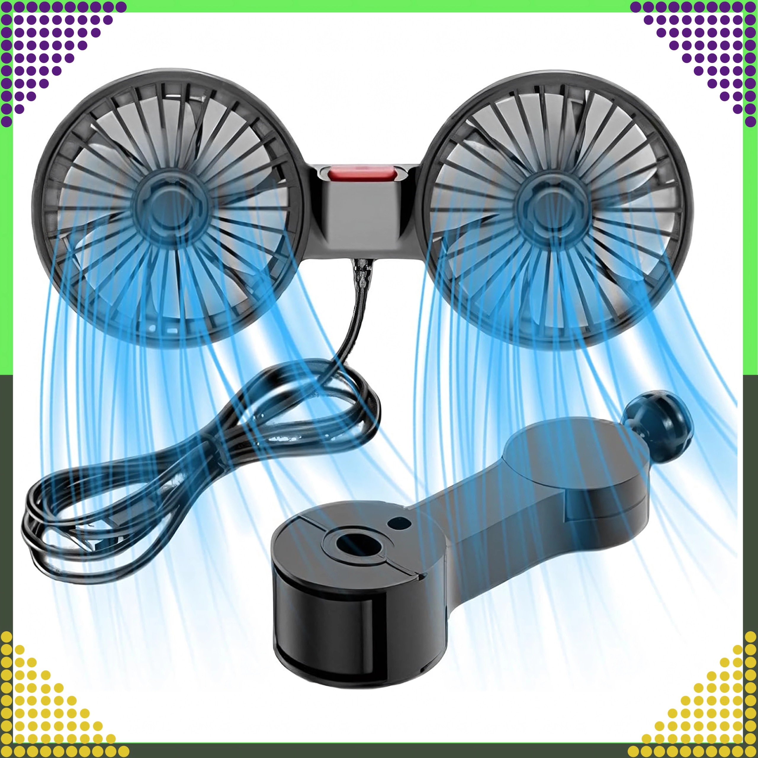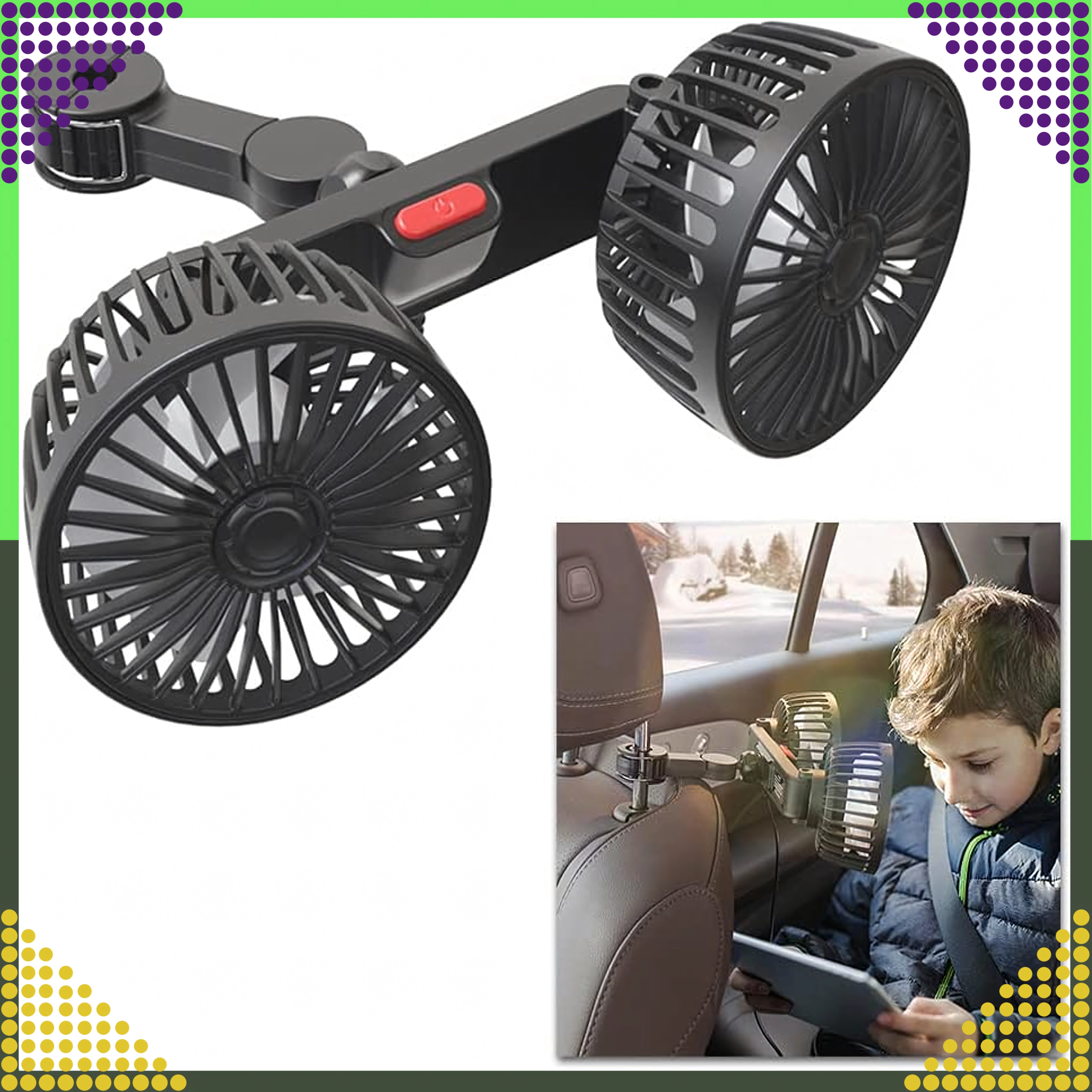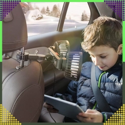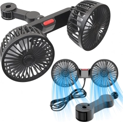 Kompakt dobbelt ventilator til nakkestøtte giver kraftig luftstrøm og støjsvag køling til bagsæderne. Med 360° roterende hoveder kan du nemt rette luftstrømmen derhen, hvor den behøves. Kan forsynes med 12/24 V i bilen eller 5 V via USB, så den er ideel til bil, autocamper, barnevogn eller camping.