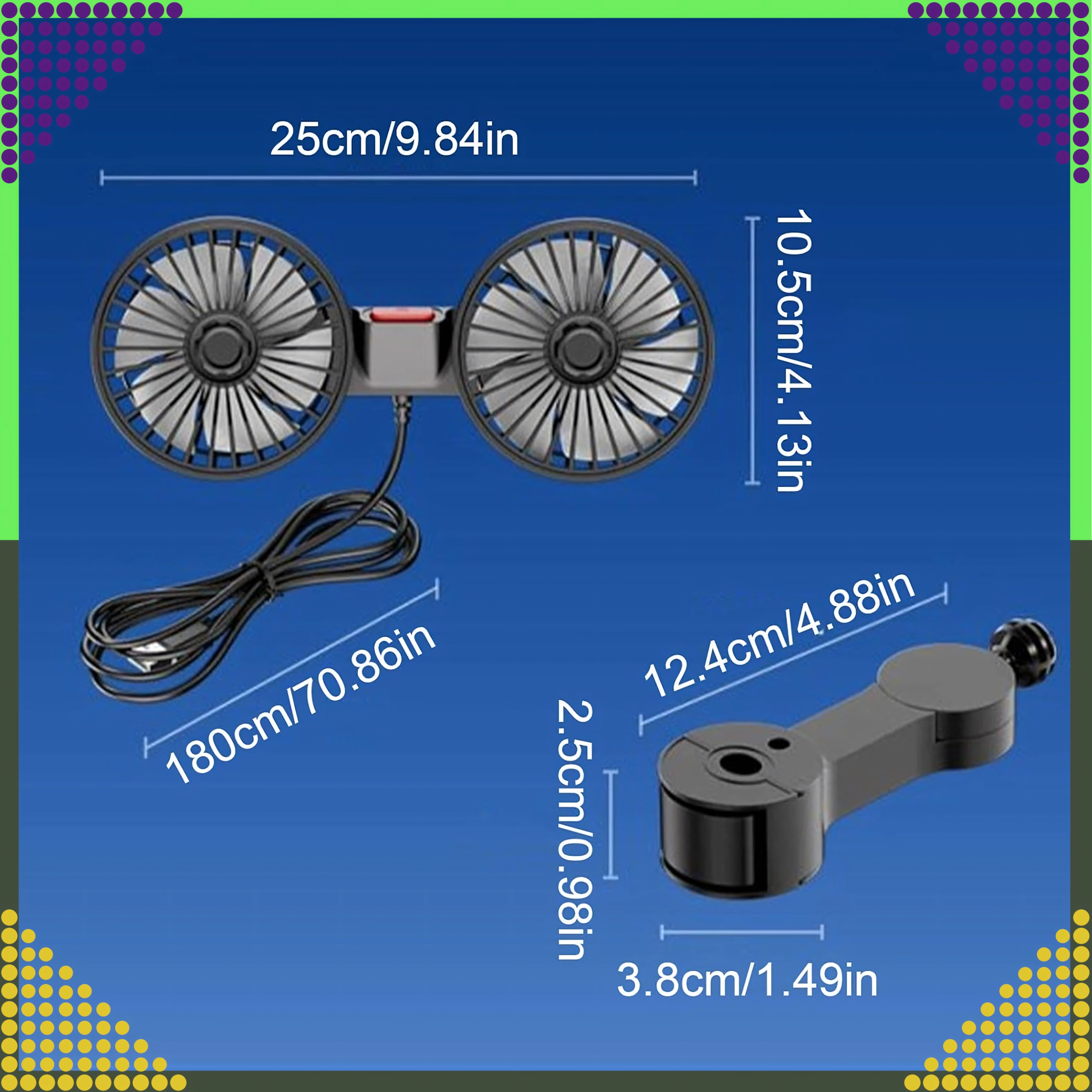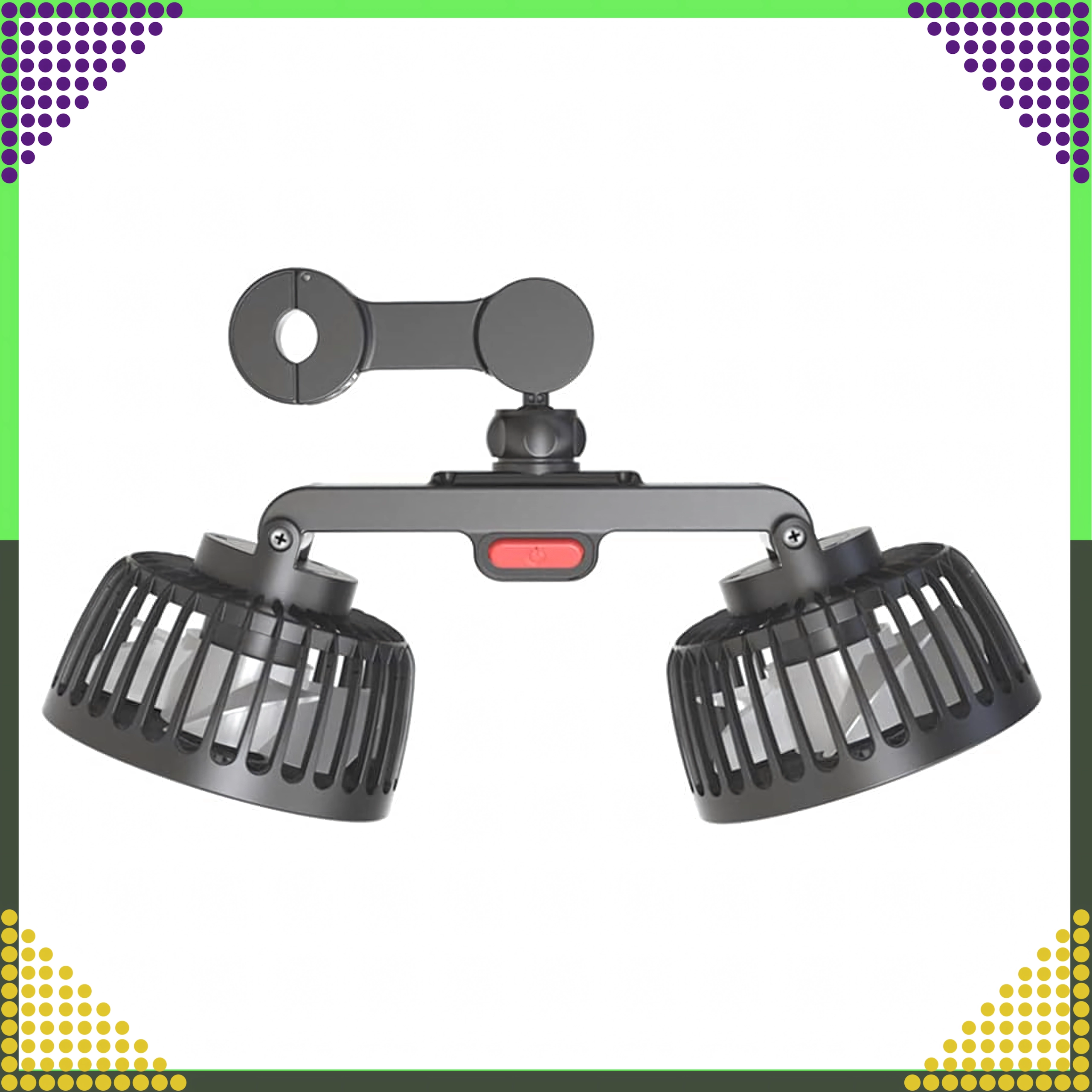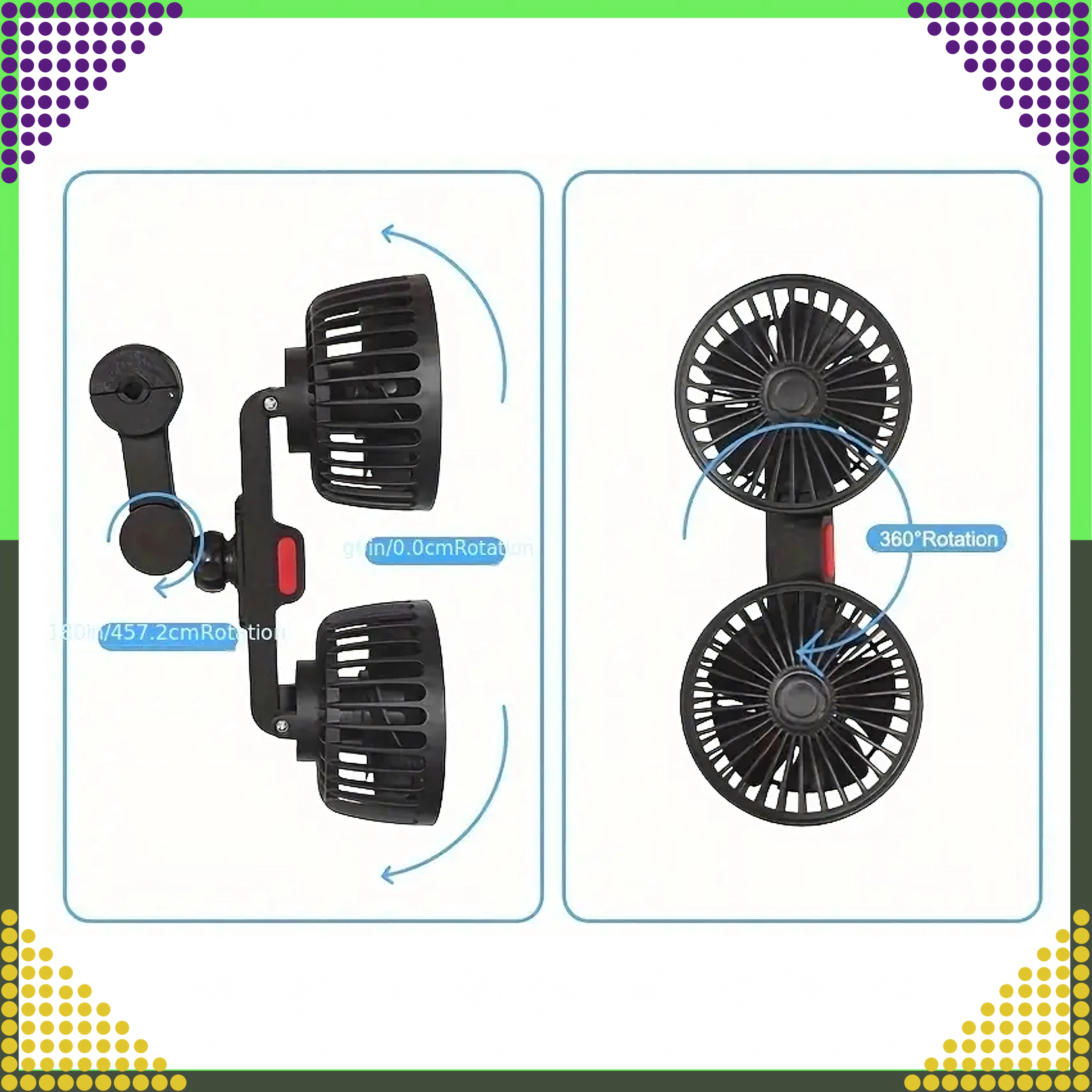 Kompakt dobbelt ventilator til nakkestøtte giver kraftig luftstrøm og støjsvag køling til bagsæderne. Med 360° roterende hoveder kan du nemt rette luftstrømmen derhen, hvor den behøves. Kan forsynes med 12/24 V i bilen eller 5 V via USB, så den er ideel til bil, autocamper, barnevogn eller camping.