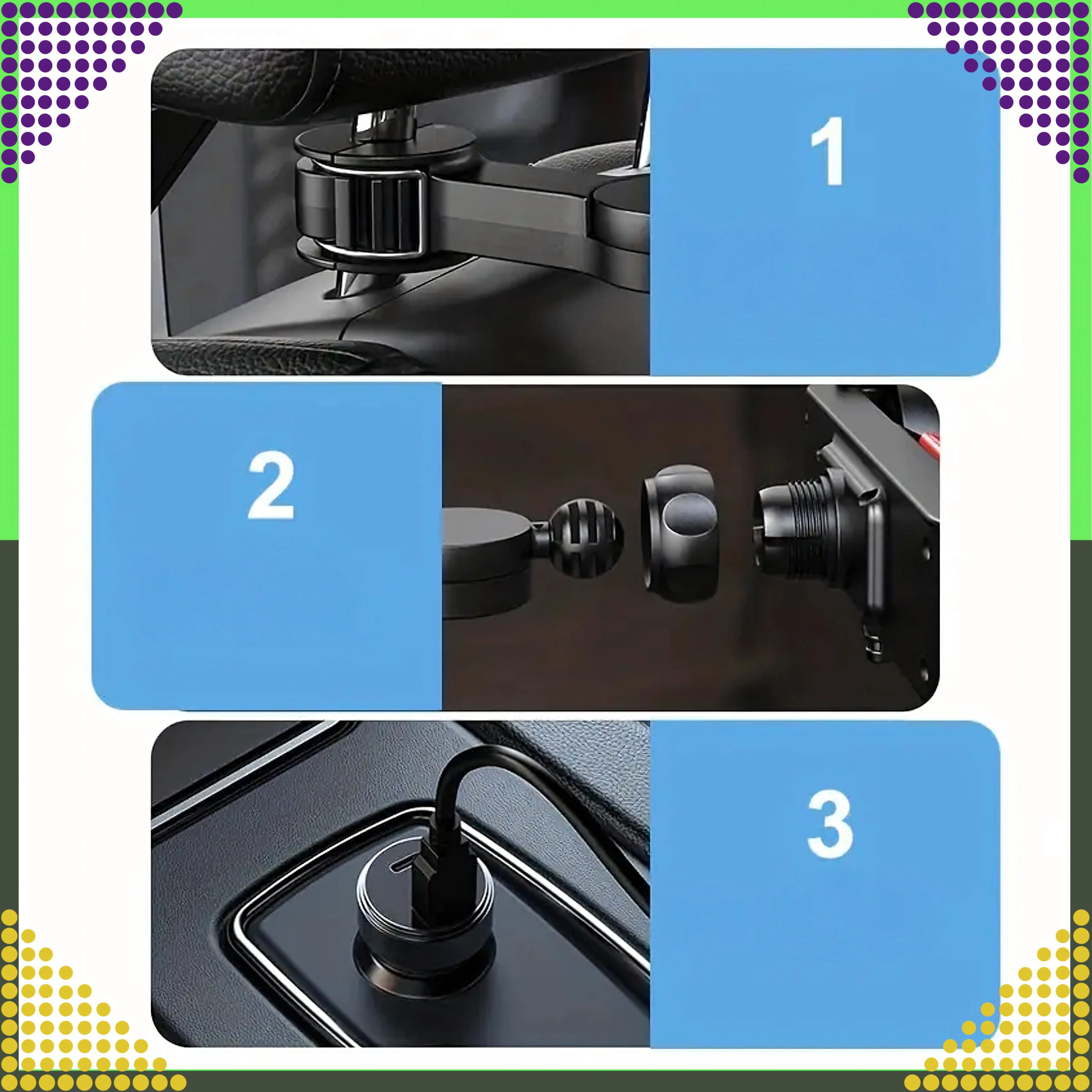 Takket være 12/24 V og USB 5 V strøm er enheden universel – tilslut den i bilen, til en powerbank, laptop eller adapter. Nem installation med klemme på nakkestøttens stænger betyder ingen boring eller værktøj.