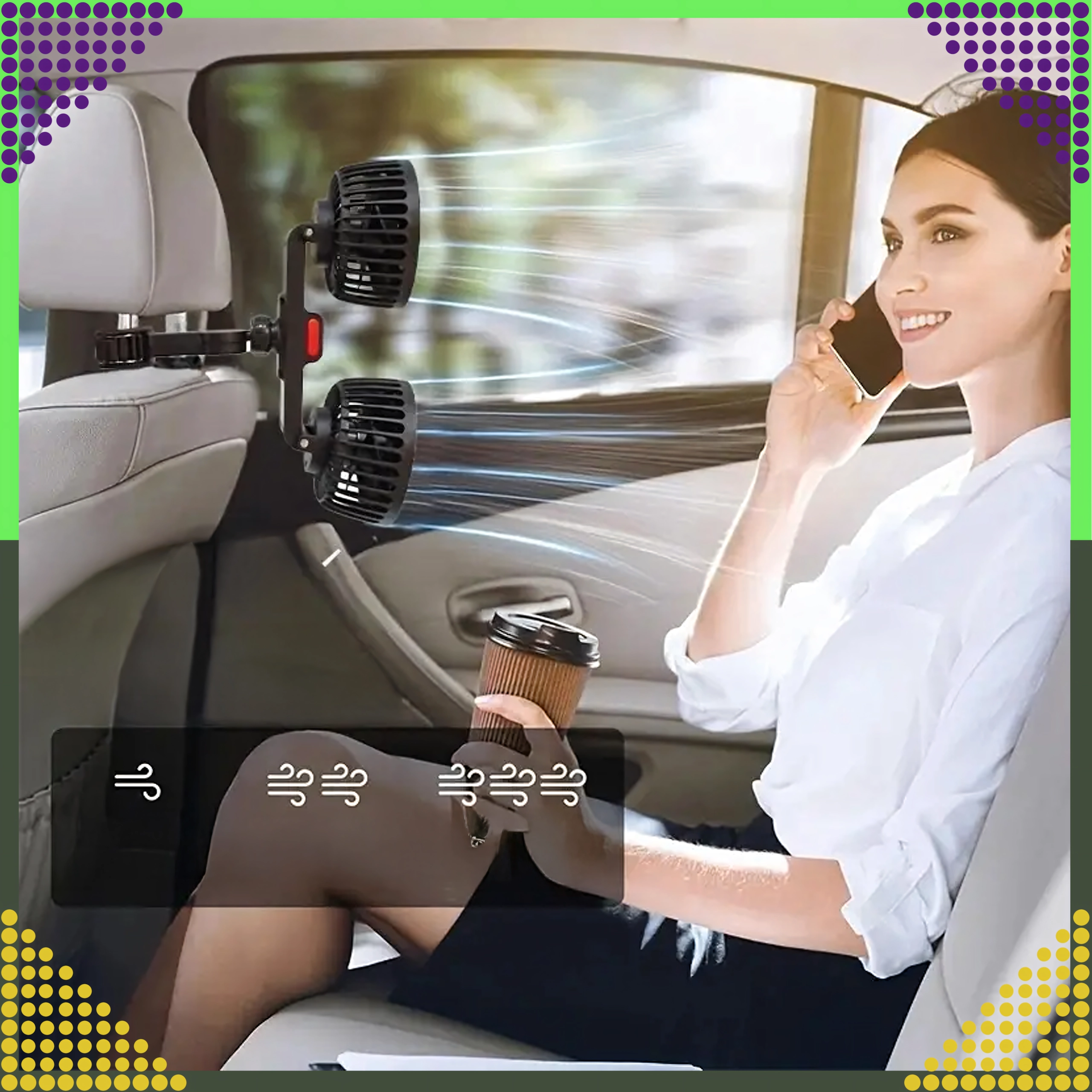 Nyd et behageligt klima på farten. Den dobbelte ventilator med montering på nakkestøtten giver bred dækning til begge bagpassagerer, mens den stille drift sikrer komfortable ture – også med børn. 360° roterende hoveder og justerbart led muliggør præcis retningsstyring af luften.