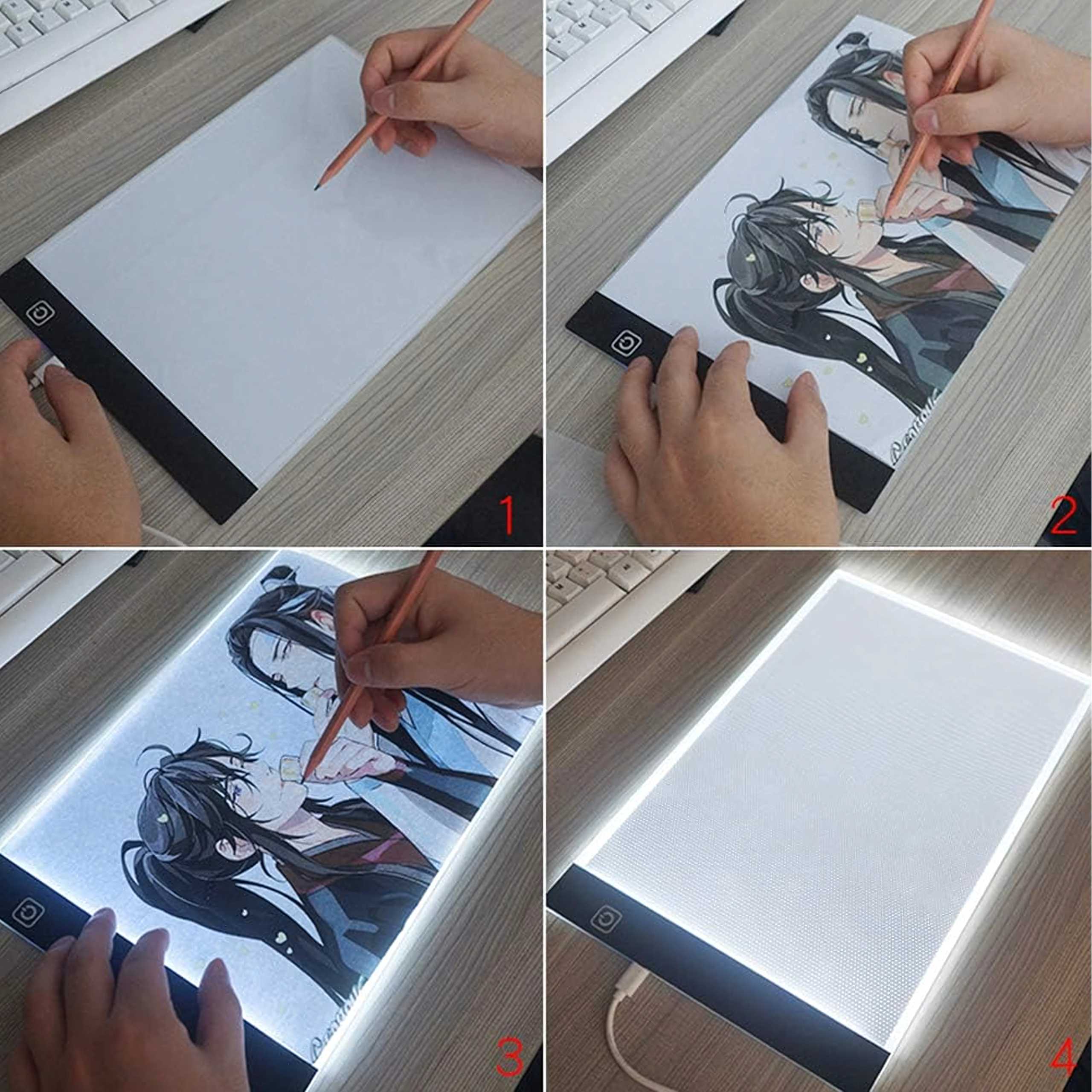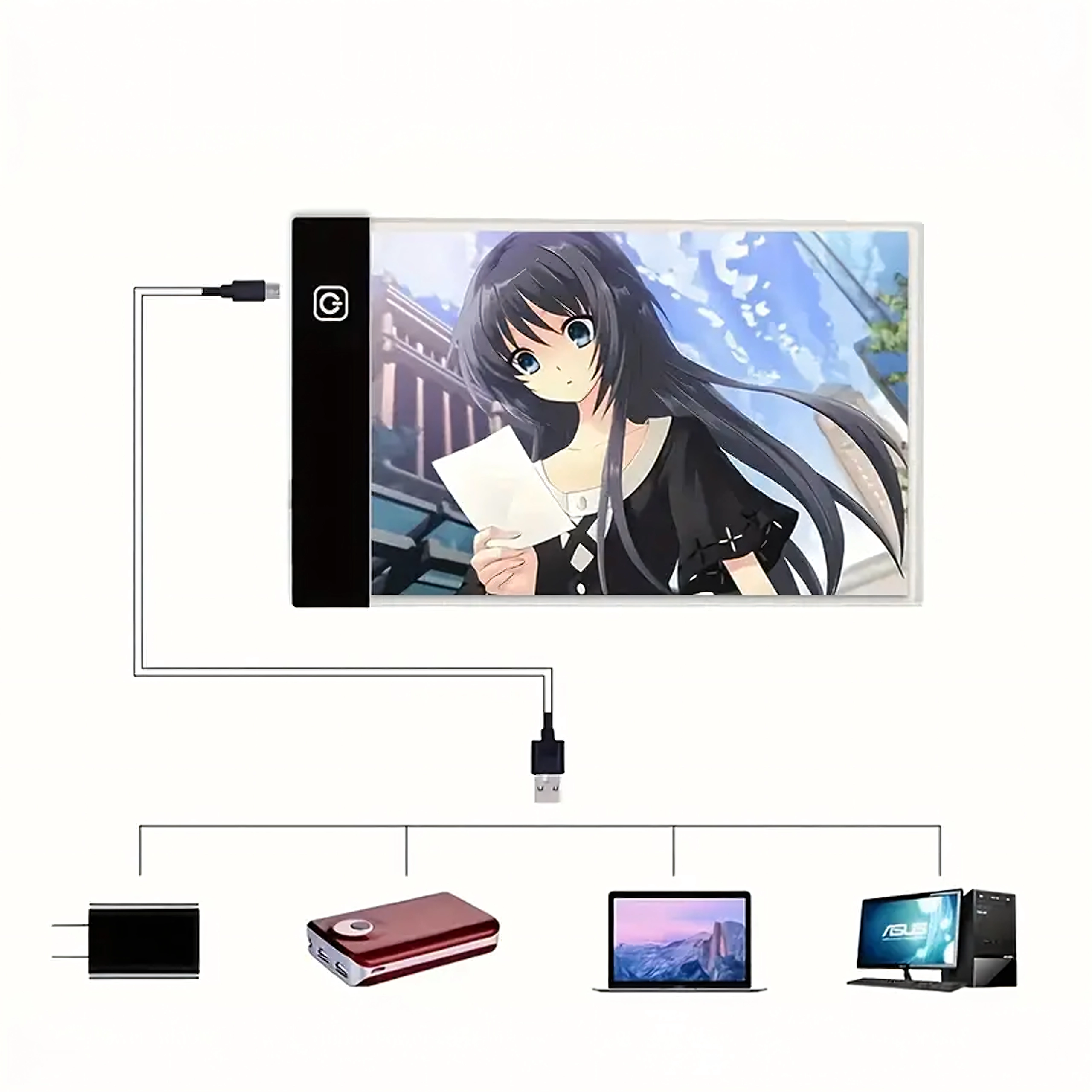 Tilslut lysbordet til en bærbar, powerbank eller adapter. Den berøringsfølsomme knap muliggør øjeblikkelig tænding og komfortabel brug.
