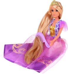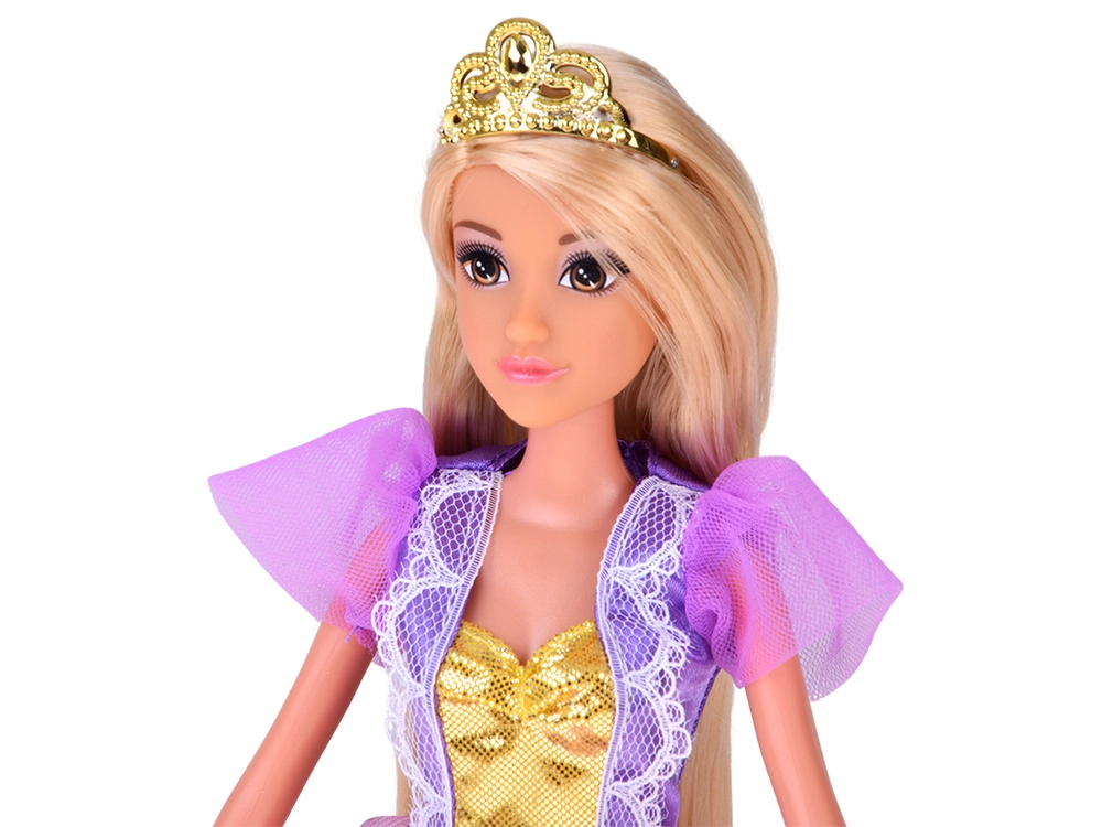 Denne prinsesse imponerer med en rigt dekoreret kjole med glitrende tyl, gyldne ornamenter og et yndefuldt liv. Meget langt, letredeligt hår er ideelt til at skabe frisurer – fra fletninger til festlige knolde. Leddelte arme gør naturlig posering mulig og åbner for endnu flere legescenarier.