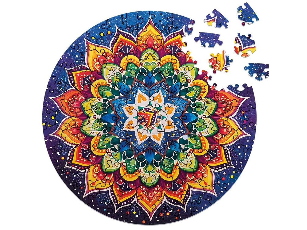 Dette kunstneriske puslespil bringer et unikt mandalamotiv, der fremmer ro og kreativitet. Trækonstruktionen sikrer styrke og lang levetid, mens de uregelmæssige former gør lægningen både sjov og stimulerende.