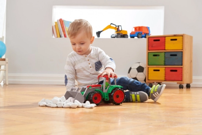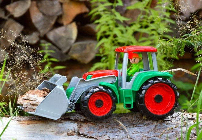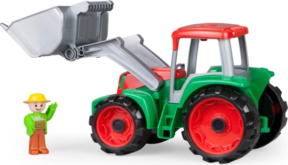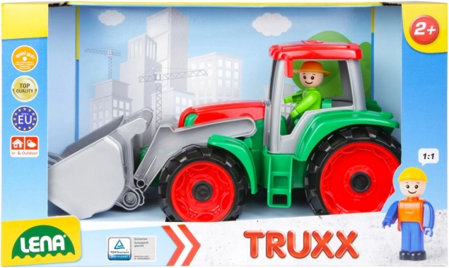 Farverig TRUXX traktor med frontlæsser, der begejstrer små byggere. Med en længde på 35 cm, bevægelig skovl, vippe-kabine og medfølgende figur byder den på masser af sjov både hjemme og i sandkassen. Fremstillet af kvalitets, fleksibel plast og opfylder europæiske sikkerhedsstandarder.